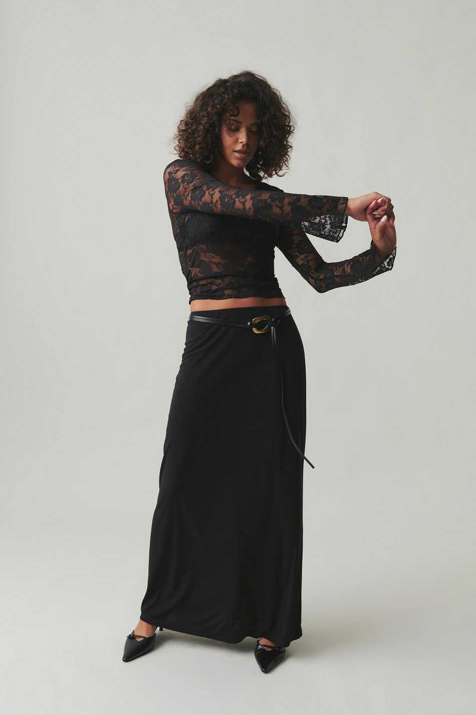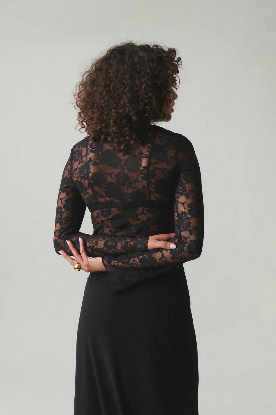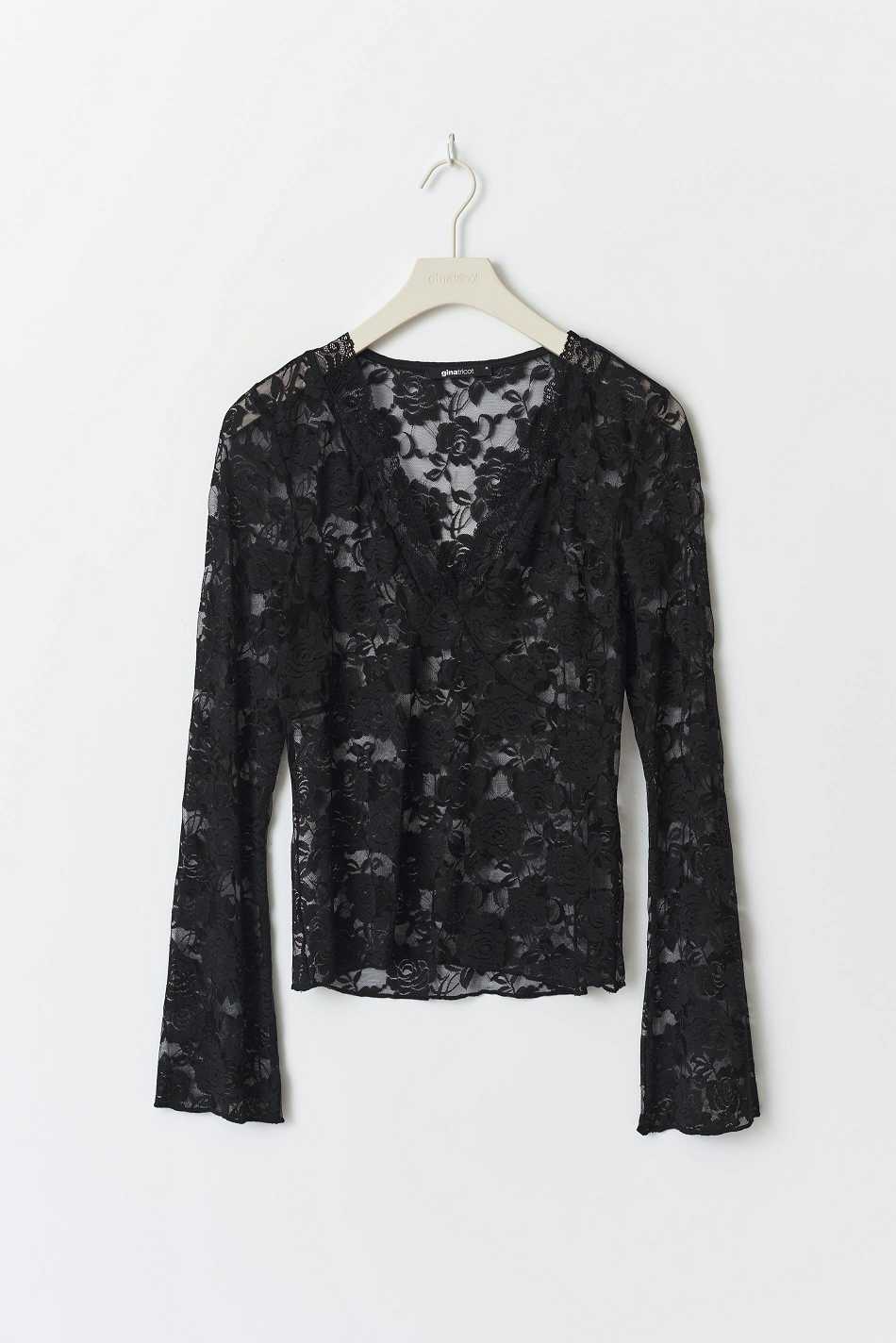 Long-sleeved lace top with v-neck. The top is black and has floral pattern. It has figure-hugging fit and regular length. Unlined.