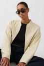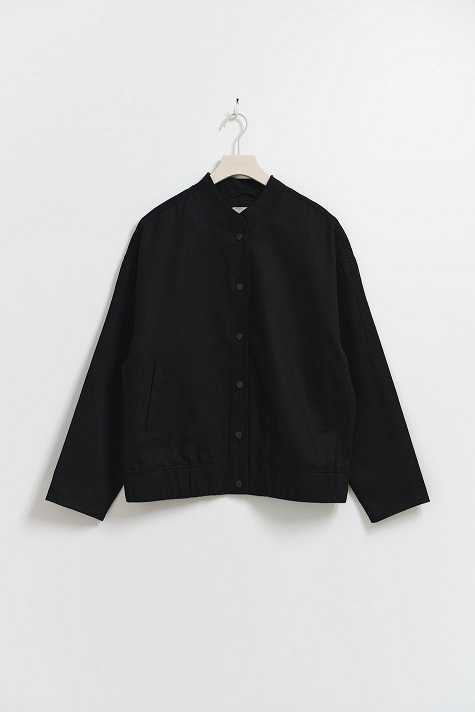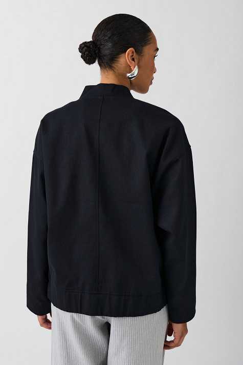 Bomber jacket in linen blend with an oversize fit. The jacket is black and has snap button closure at the front. It has woven quality, small collar and slant pockets in the sides.