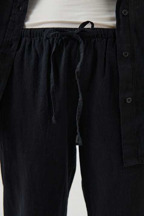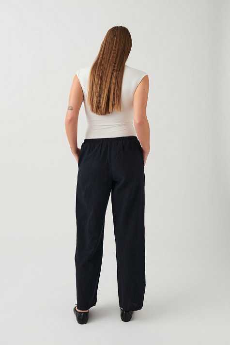Linen trousers with wide legs. The linen trousers are black and have mid waist. They have side pockets and elastic at the waist with self-tie drawstring at the front.