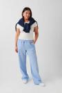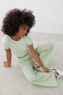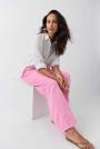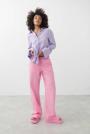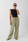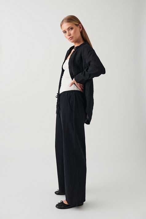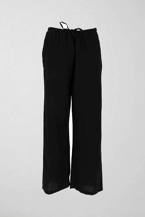 Linen trousers with wide legs. The linen trousers are black and have mid waist. They have side pockets and elastic at the waist with self-tie drawstring at the front.