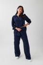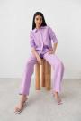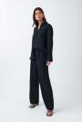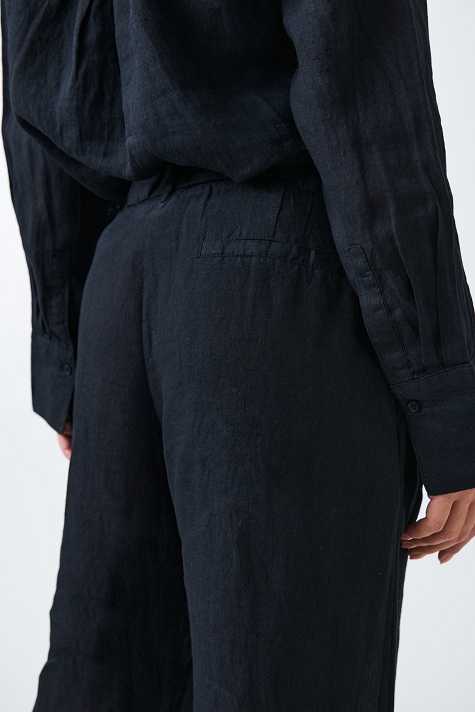 Linen trousers with loose-fitting style. The linen trousers are black and have pleats at the front. They have straight legs, elastic at the back of the waist, belt loops, side pockets and a welt pocket at the back.