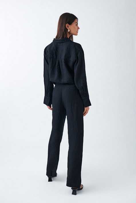 Linen trousers with loose-fitting style. The linen trousers are black and have pleats at the front. They have straight legs, elastic at the back of the waist, belt loops, side pockets and a welt pocket at the back.