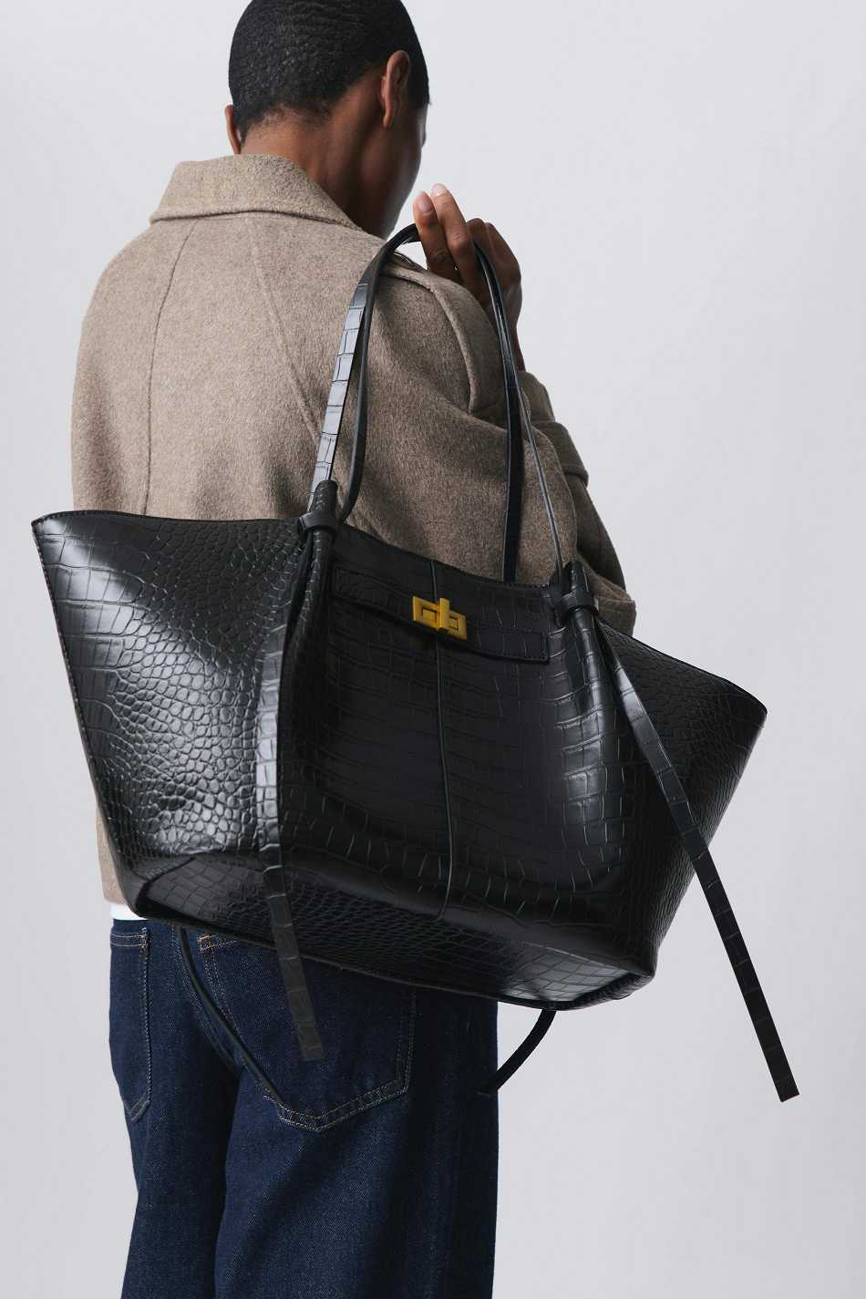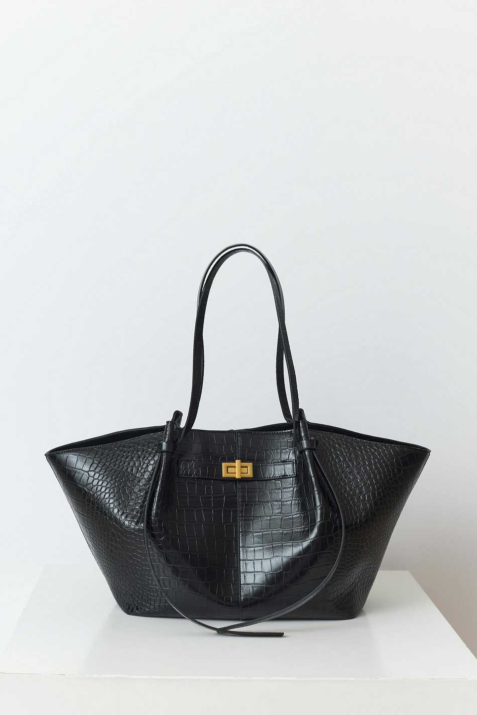 Bag in imitation leather with a crocodile pattern and double handles. The bag is large and has gold coloured buckle. It has magnetic closure and inner compartment.