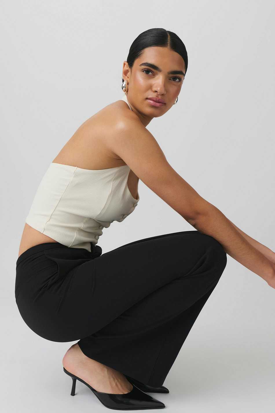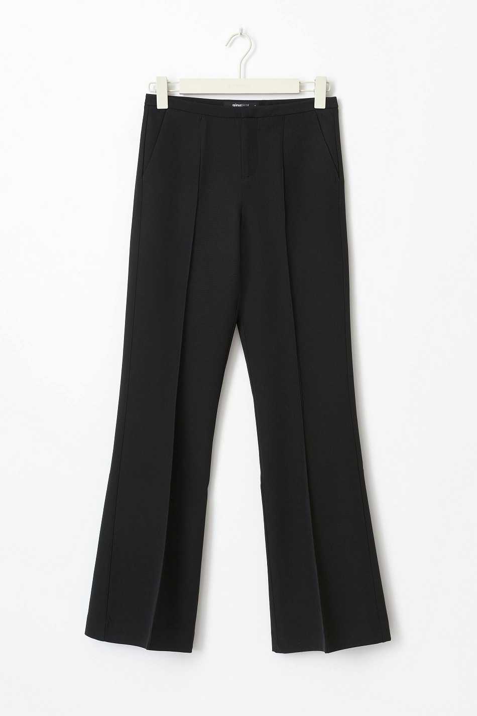 Flared suit trousers with creases at the front. The trousers are black and have pockets in the sides. They have zip fly, hook-and-eye closure and back pocket.