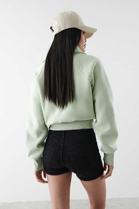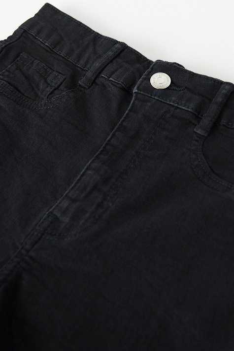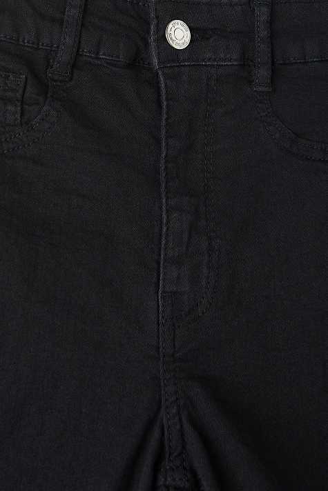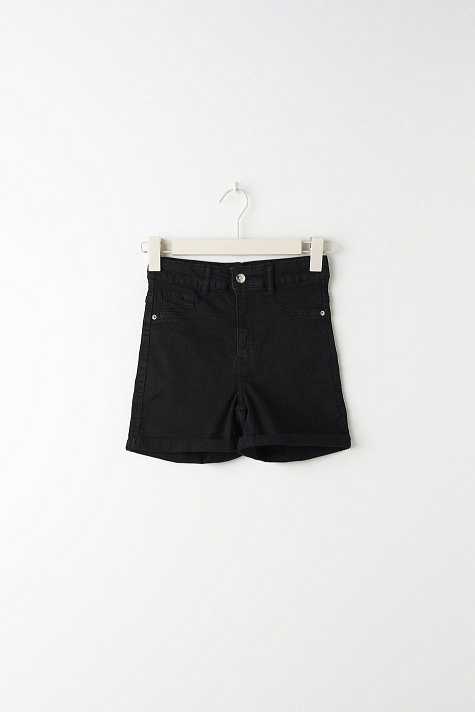 Short denim shorts with high waist. The shorts are black and have quality with superstretch. They have figure-hugging fit, zip fly, sewn, fold up hem, fake pockets at the front and real back pockets.