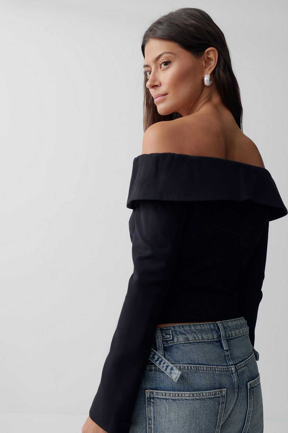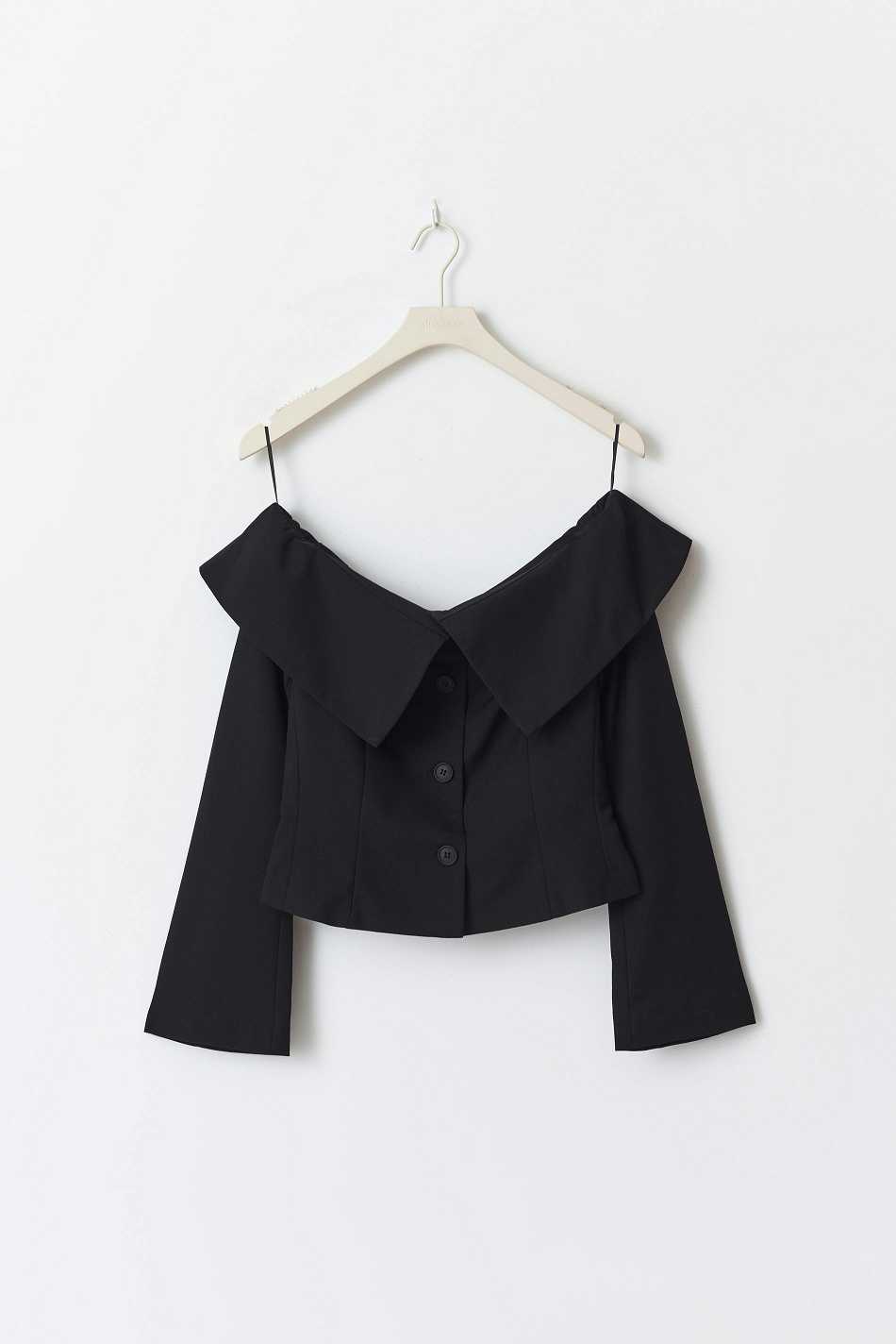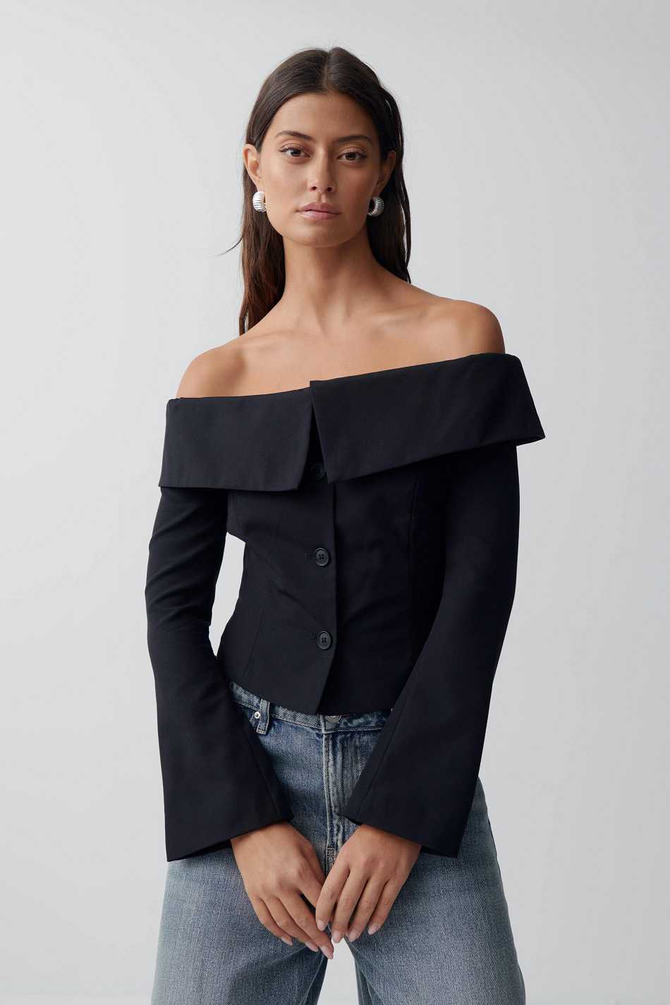 Suit jacket with off shoulder design. The jacket is black and has buttoning at the front. It has regular fit, lantern sleeve and turn-down upper edge.