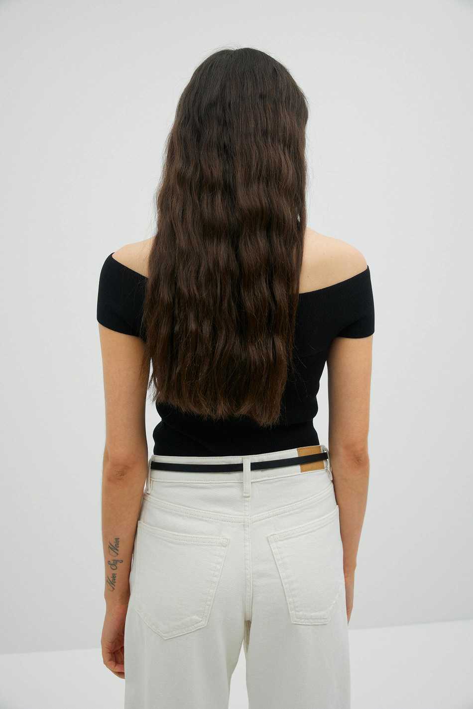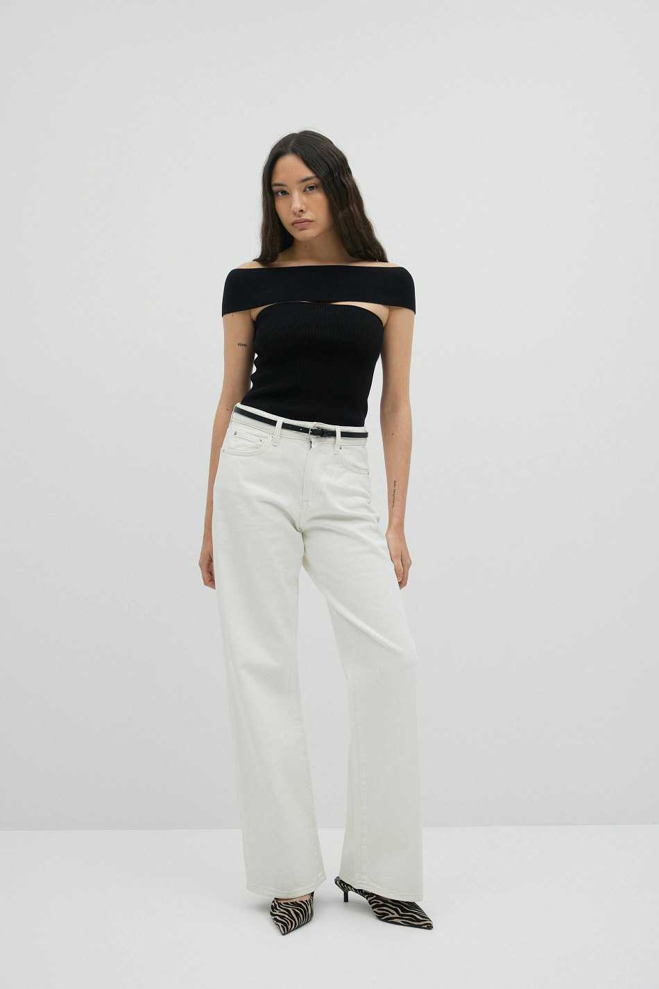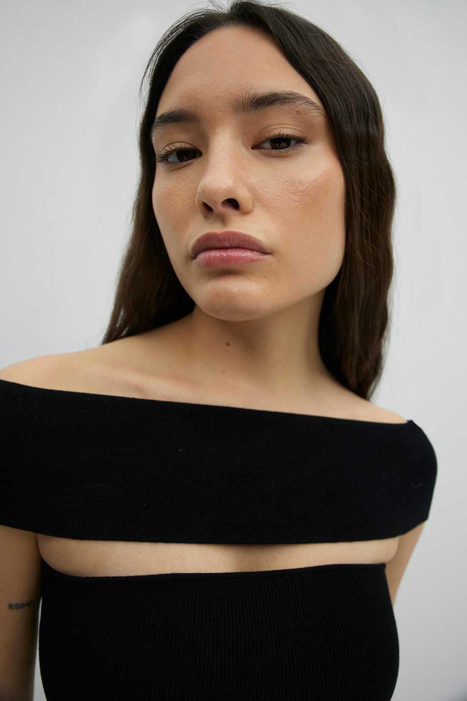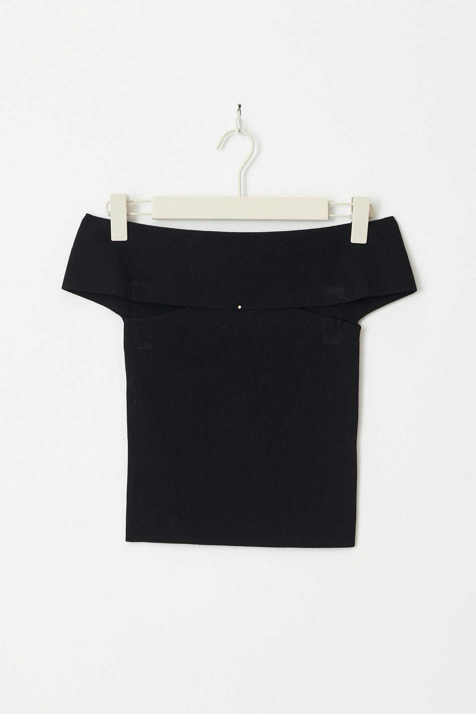Knitted off shoulder top with cut out detail at the front. The top is black and has ribbed quality.
