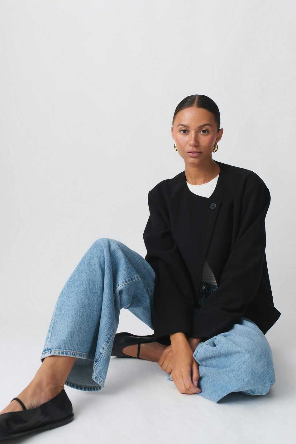 Jacket with oversize fit. The jacket is black and has one-button fastening. It has round neckline, pockets in the sides, long sleeve and regular length.
