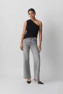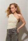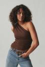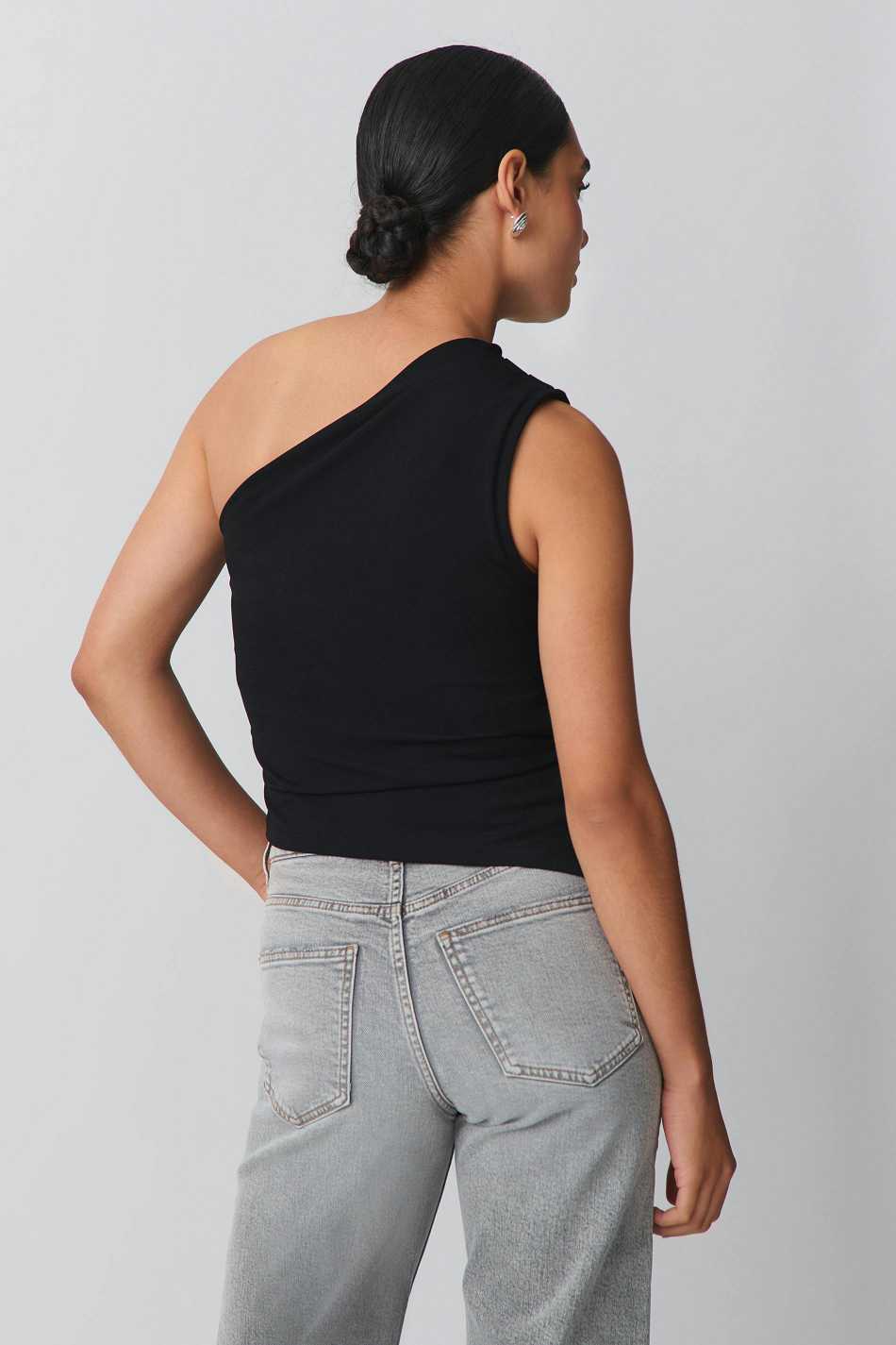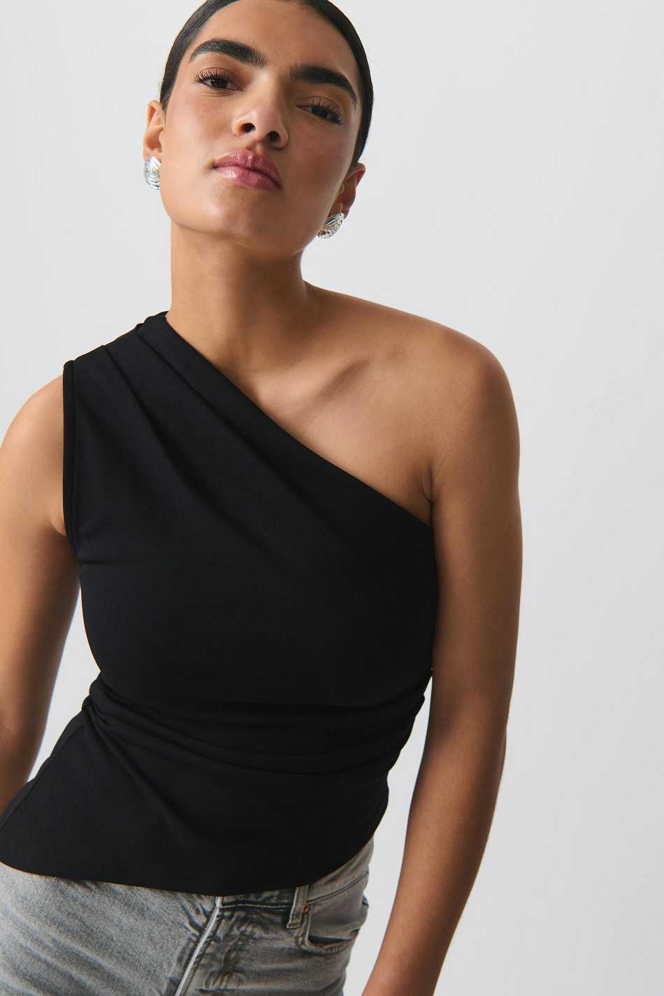 Off shoulder top with ruching at the side and on the shoulder. The top is black and has figure-hugging fit. It has stretchy quality.