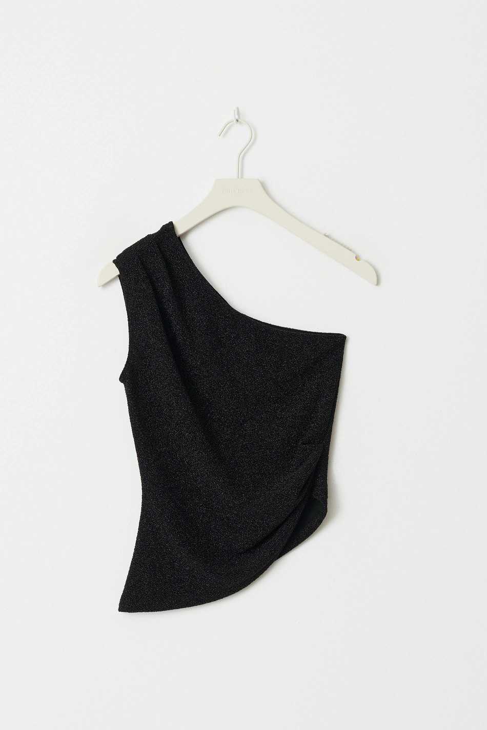 Glittery one shoulder top with sleeveless design. The top is black and has regular fit.