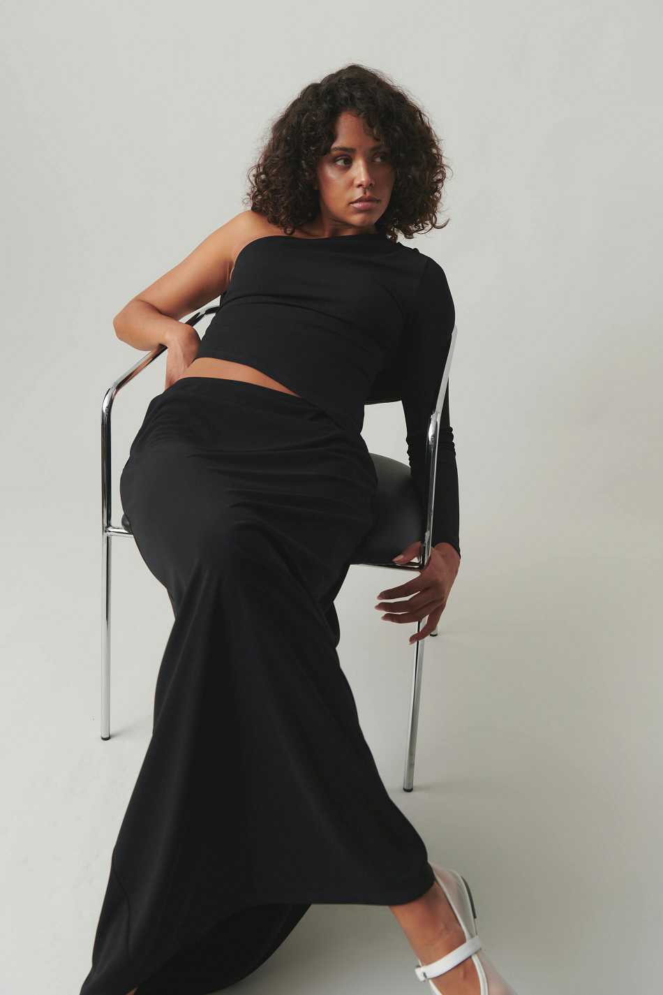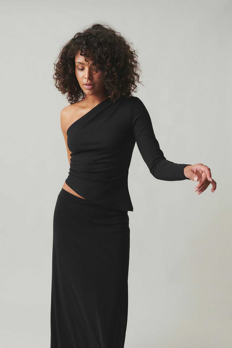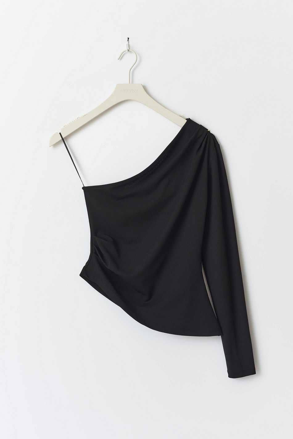 One shoulder top with regular fit. The one shoulder top is black and has pleats in the side seam and on the shoulder. It has long sleeve and regular length.
