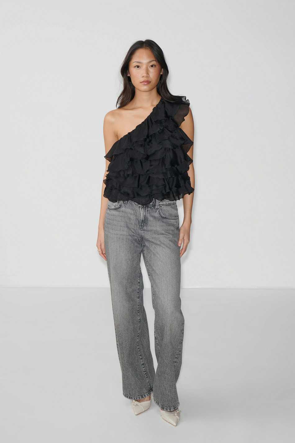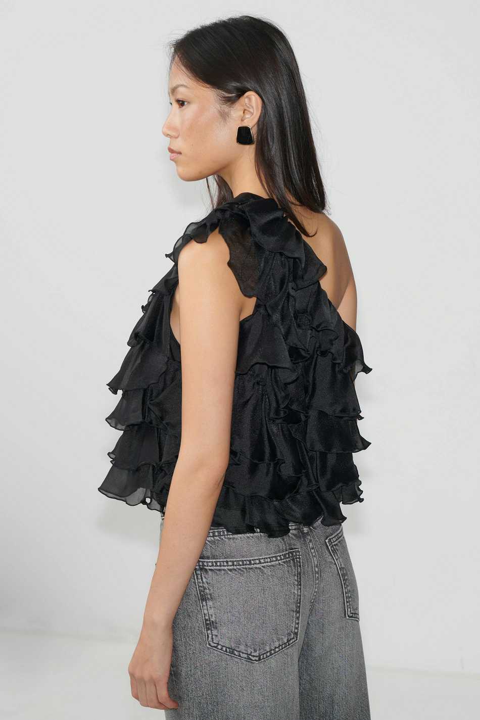 Sleeveless one shoulder top in organza with frills. The top is black and has regular fit.