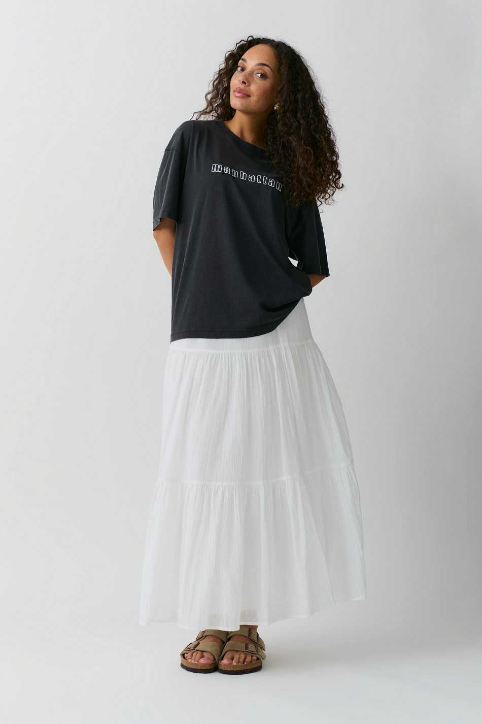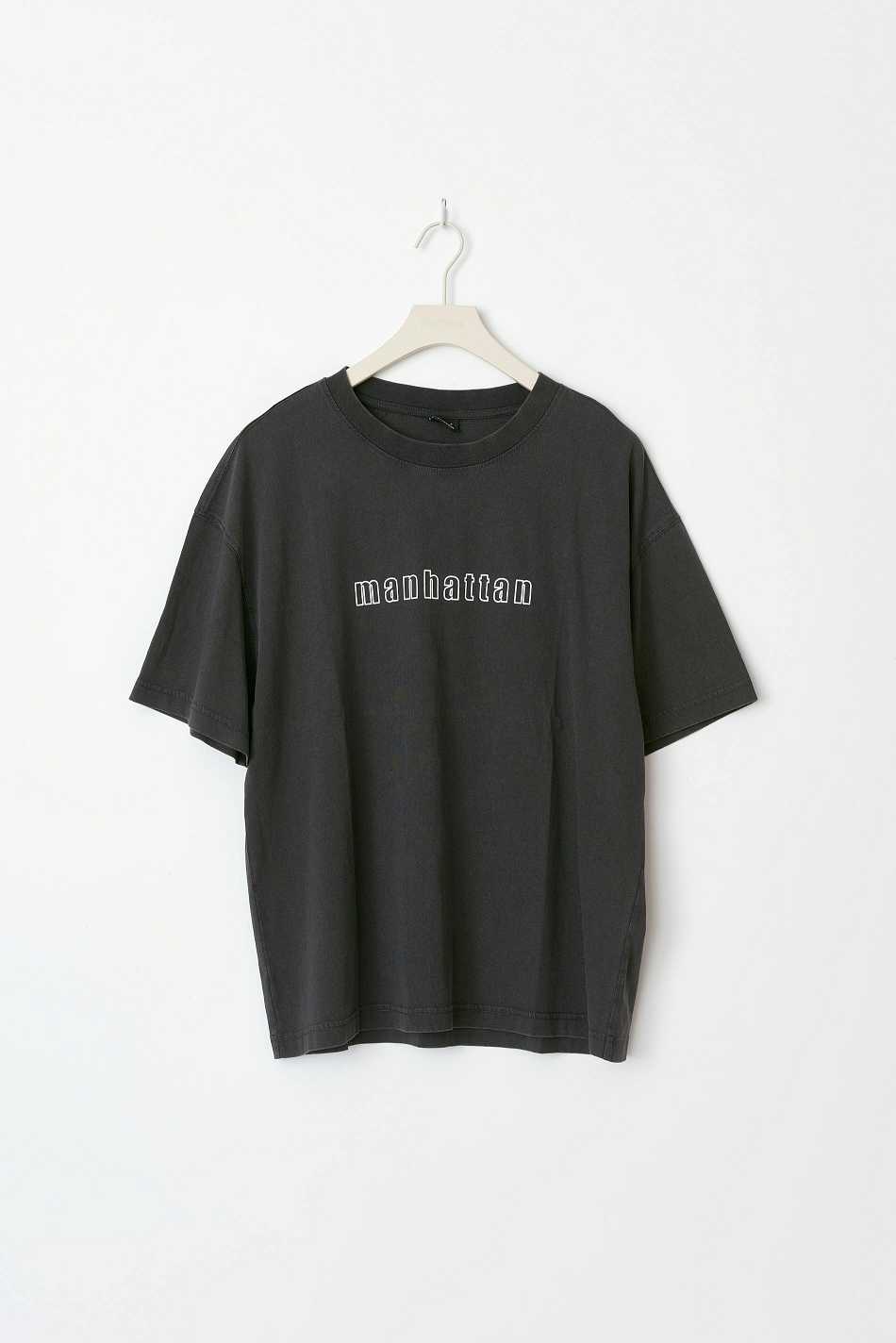 Oversized t-shirt with print at the front. The t-shirt is black-grey and has short sleeve. It has crew neckline and long fit.