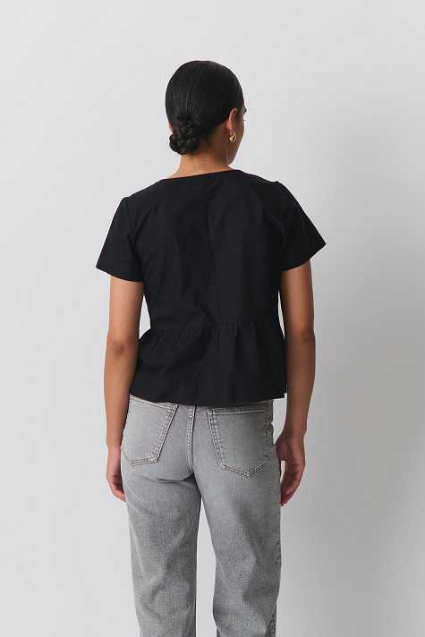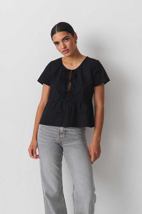 Tie blouse with peplum design. The tie blouse is black and has self-tie at the front. It has wide fit and short sleeve.