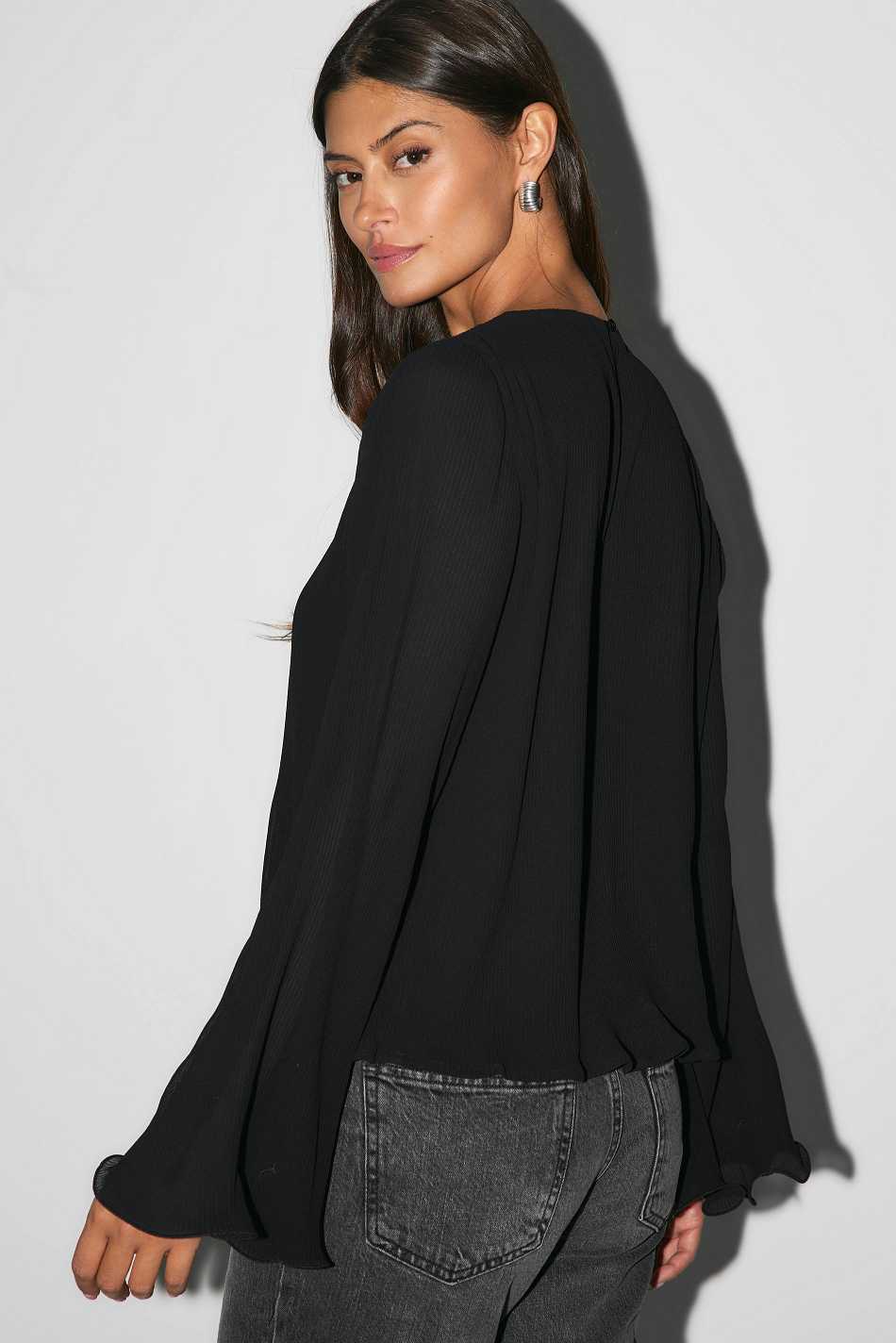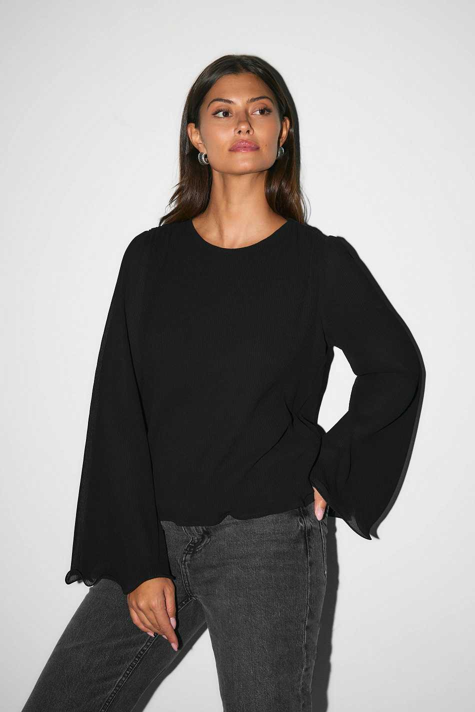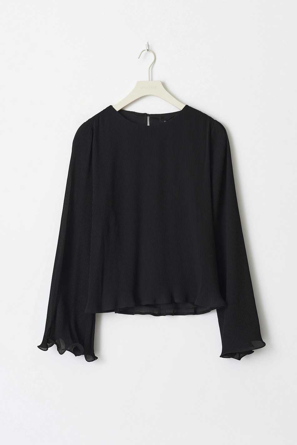 Pleated blouse with loose-fitting style. The blouse is black and has voluminous sleeve. It has round neckline and button closure at neck.
