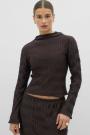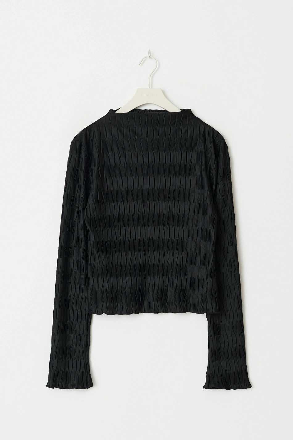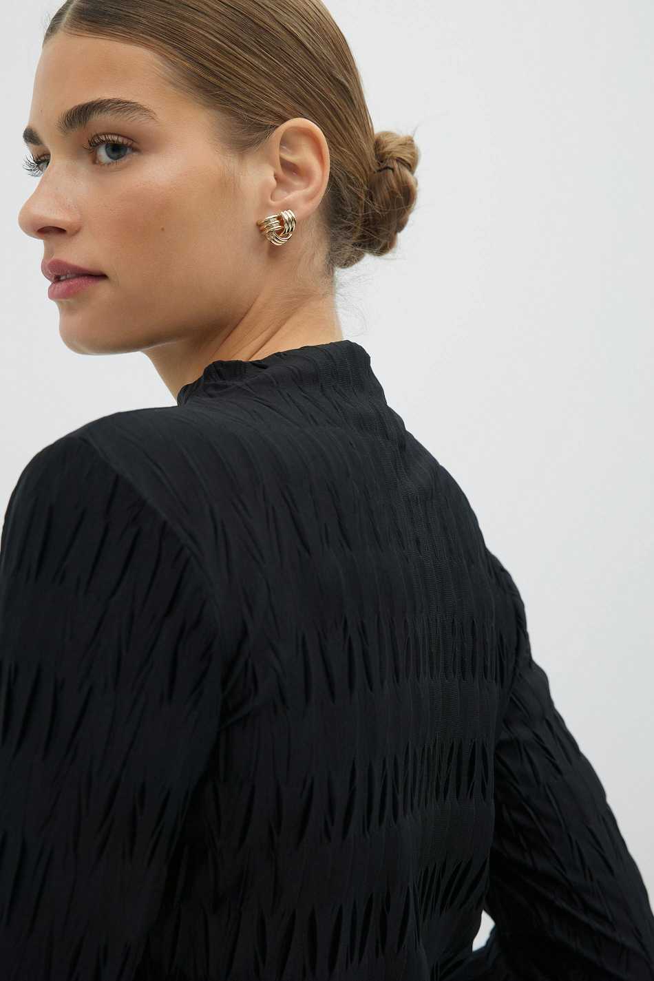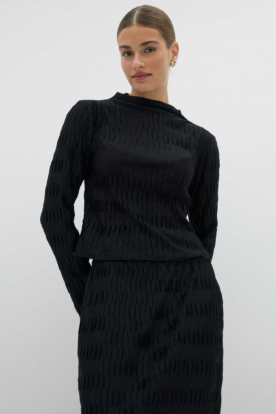Long sleeve top with funnel neck. The top is black and has textured quality. It has regular fit, dropped shoulder and overlocked hem.