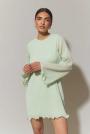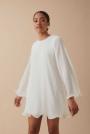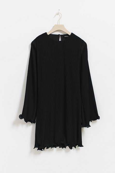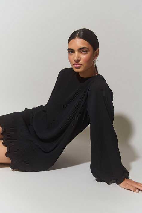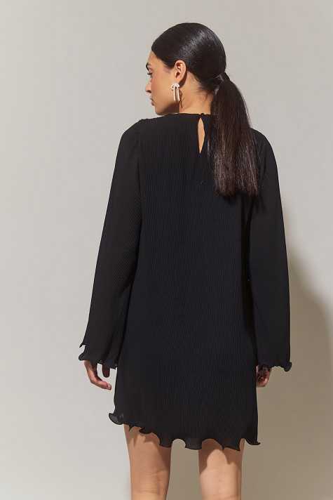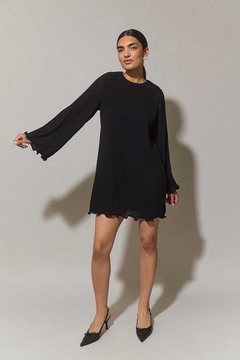 Long-sleeved dress with loose-fitting style. The dress is black, short and pleated. It has buttoning at the back, round neckline, voluminous sleeve and wavy edges.
