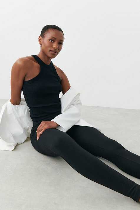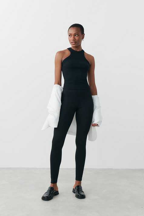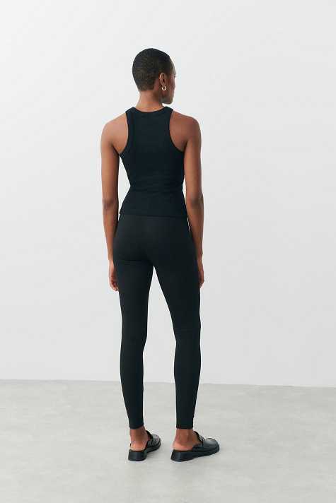 Leggings with a fitted fit. The leggings is black and has a robust material. It is made of jersey and has an elastic band at the waist and comfort stretch.