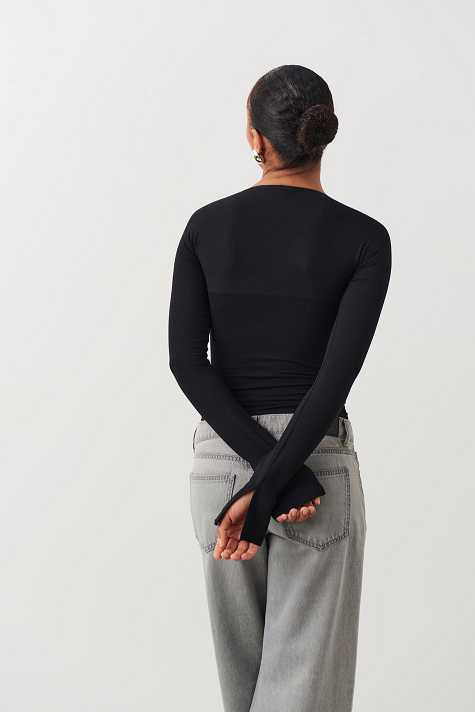 Soft touch – second skin comfort. Long-sleeved top in soft viscose with square neckline. The top is black and has figure-hugging fit. It has slit on the sleeve ends and cropped length.