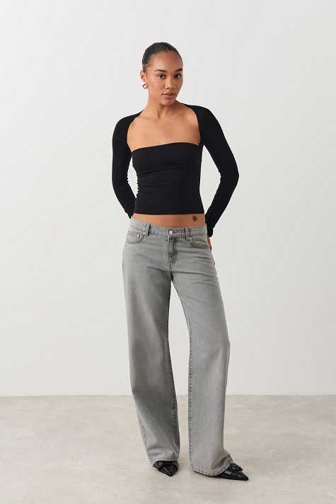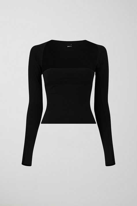Soft touch – second skin comfort. Long-sleeved top in soft viscose with square neckline. The top is black and has figure-hugging fit. It has slit on the sleeve ends and cropped length.