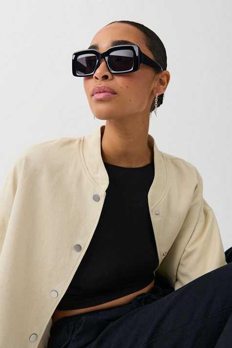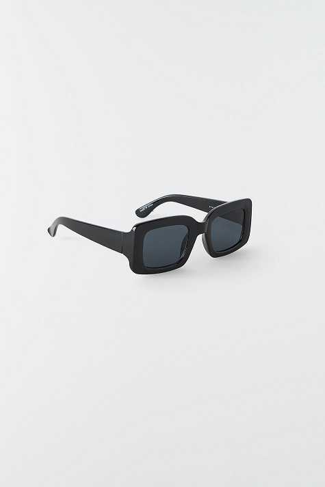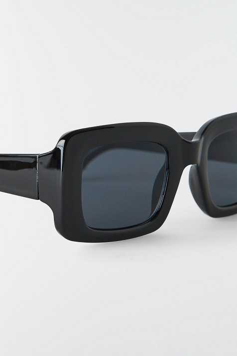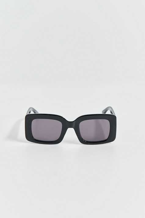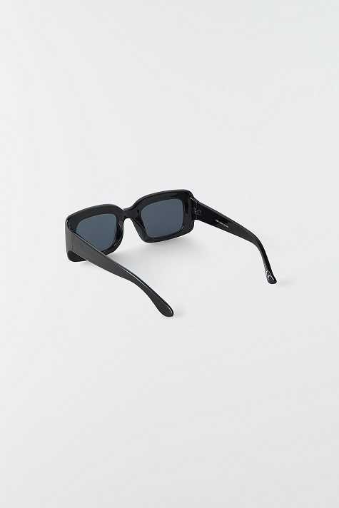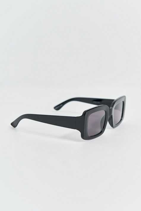 Rectangular sunglasses with a big plastic frame in 100% recycled plastic. The sunglasses are black and have a glass with UV400 protection.