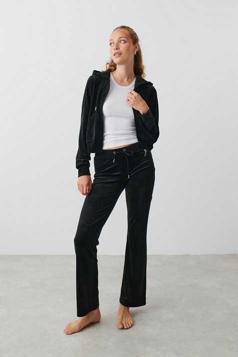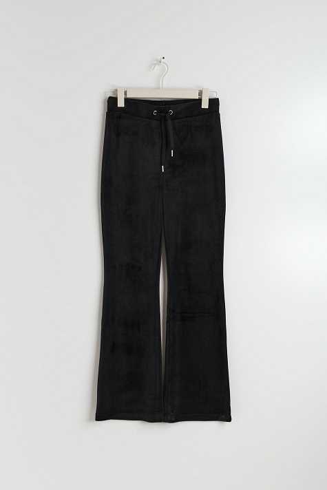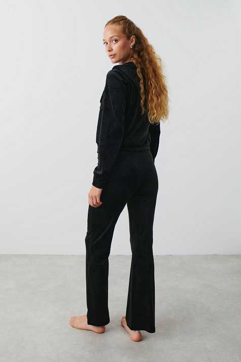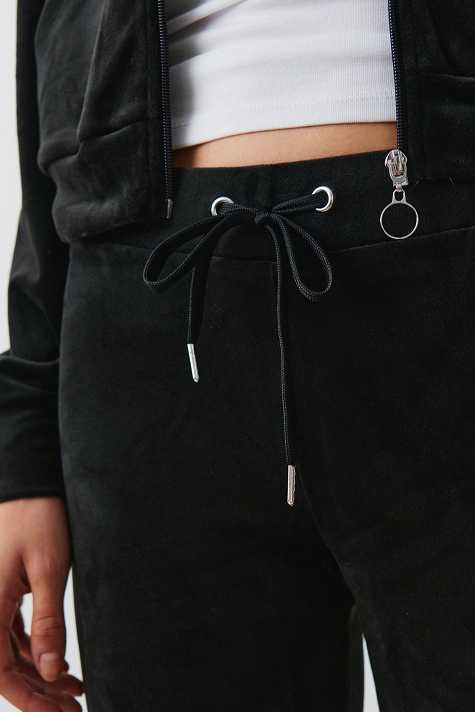 Flared trousers in velour with low waist. The trousers are black and have regular fit. They have elasticized waist and self-tie drawstring with silver details at the front.
