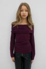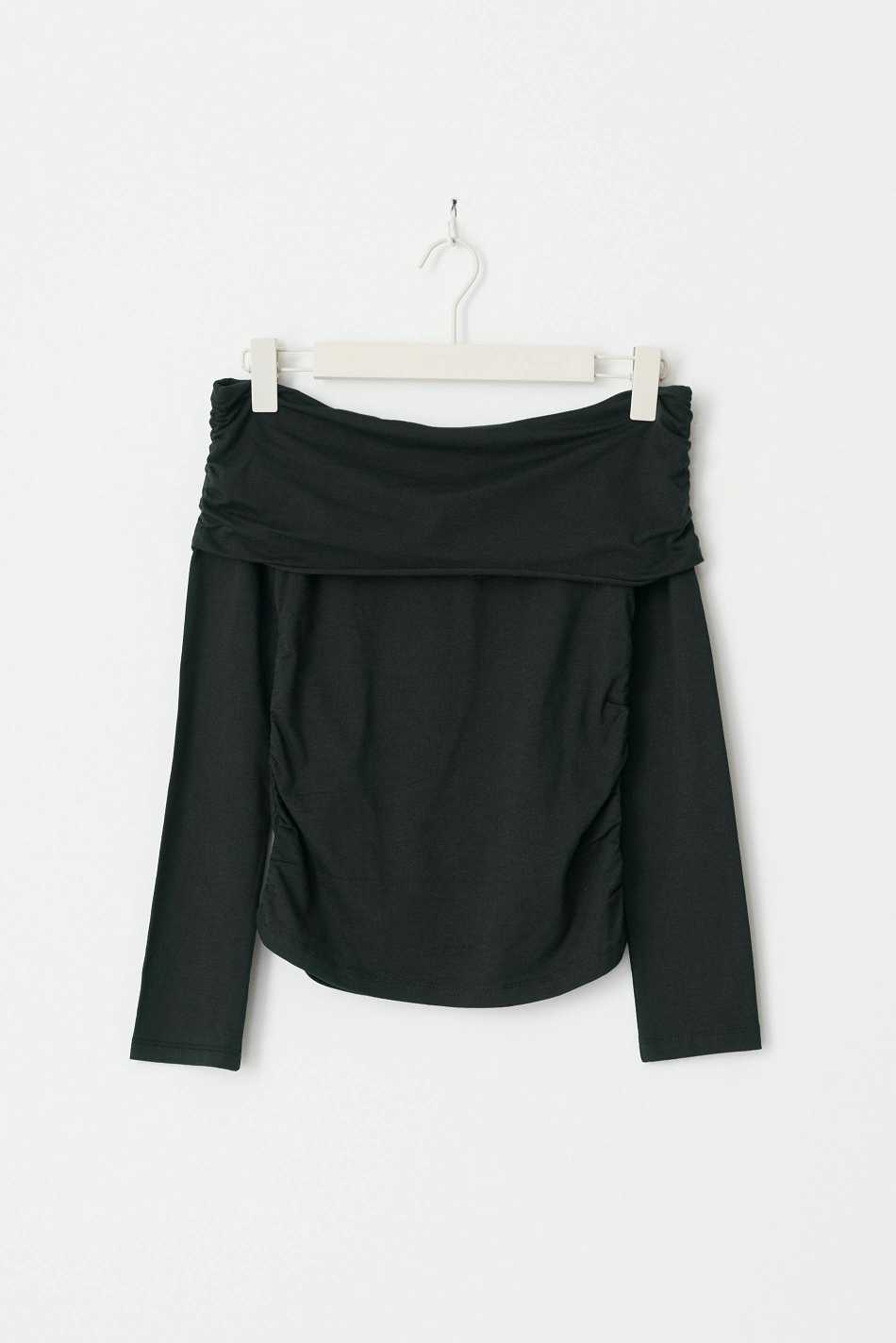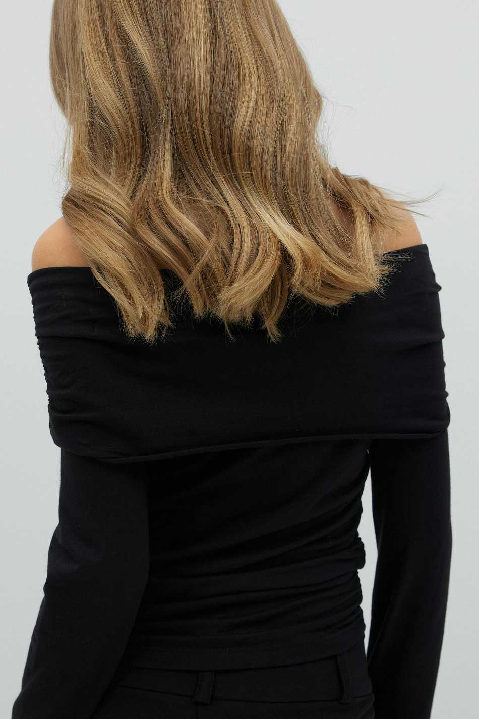 Long-sleeved off shoulder top with ruching in the sides. The top is black and has turn-down upper edge.