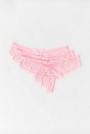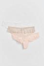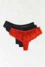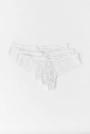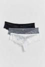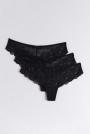 Thongs in lace with crotch lining. The thongs are blue, white and black. They have bow detail at the front.