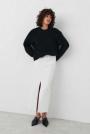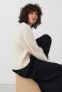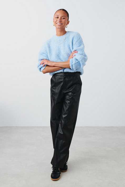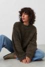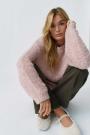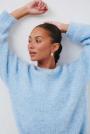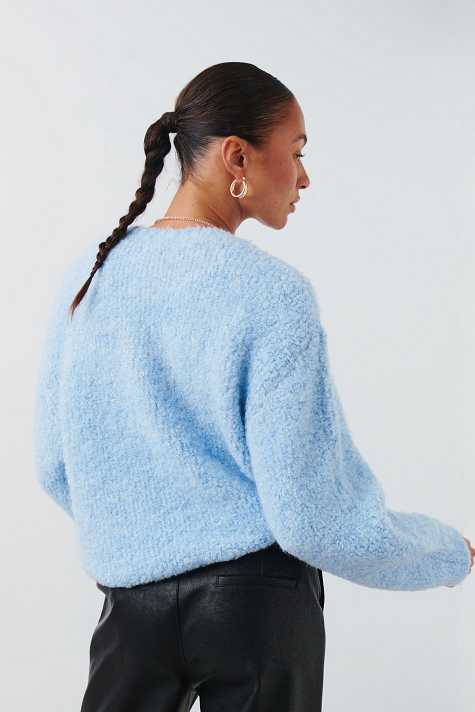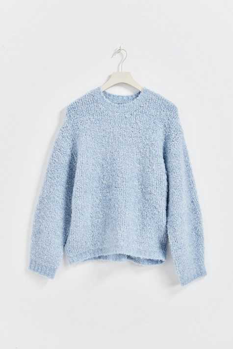 Knitted jumper in bouclé with round neckline. The jumper is blue and has loose-fitting style. It has long, voluminous sleeve.
