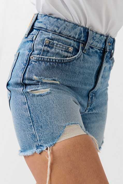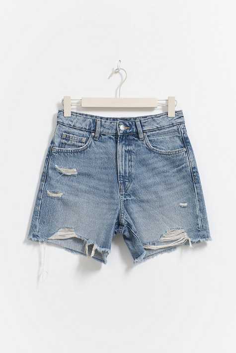 Denim shorts with rips at hem. The shorts are blue and have high waist in non-stretch denim. They have straight legs, zip fly and pockets at the front and back.