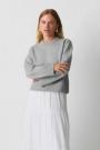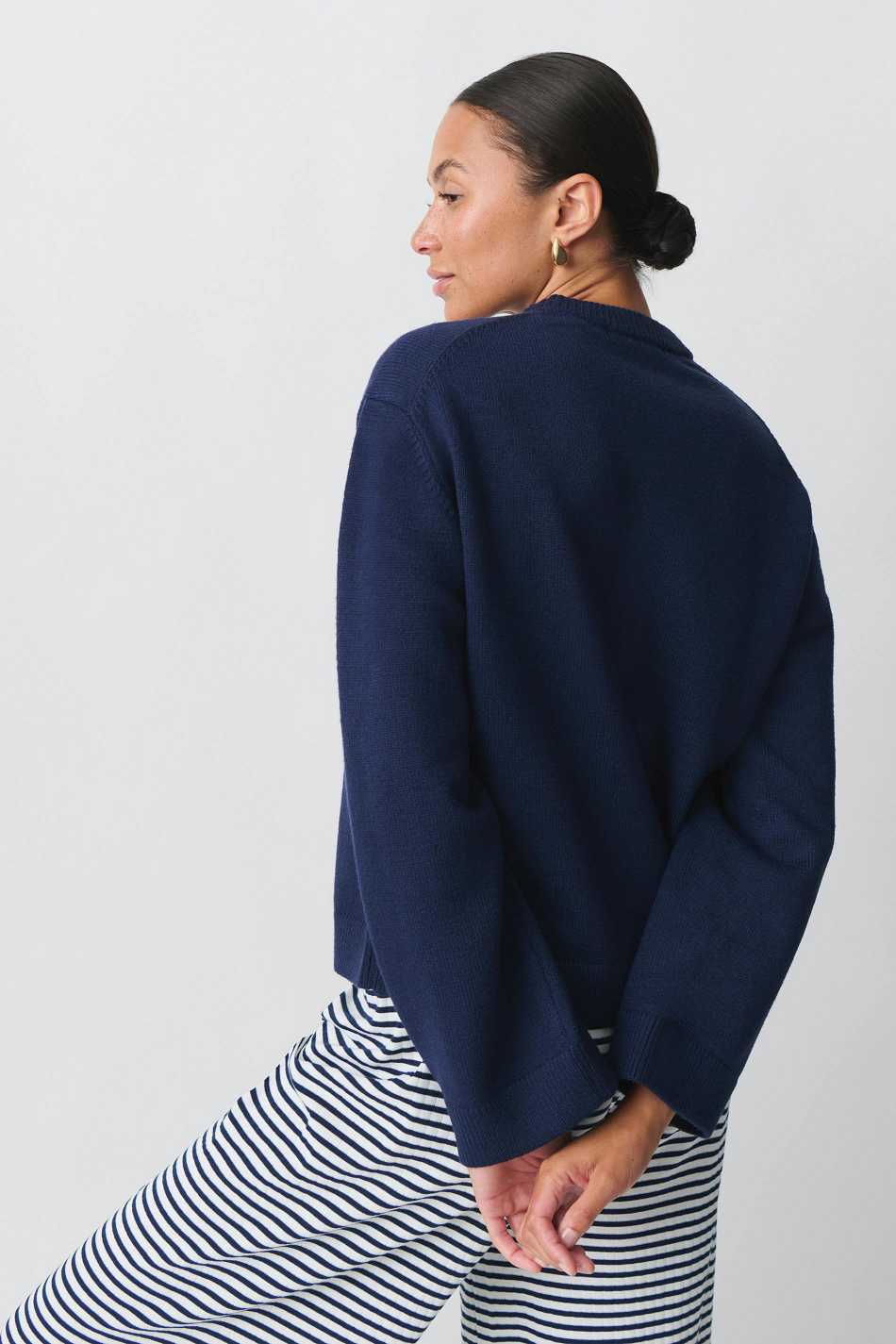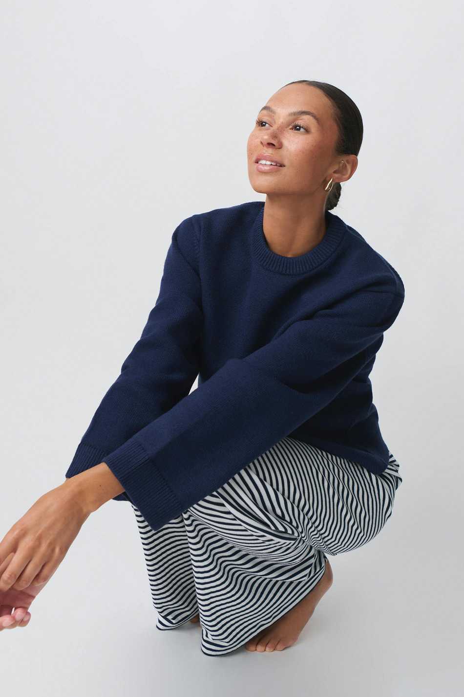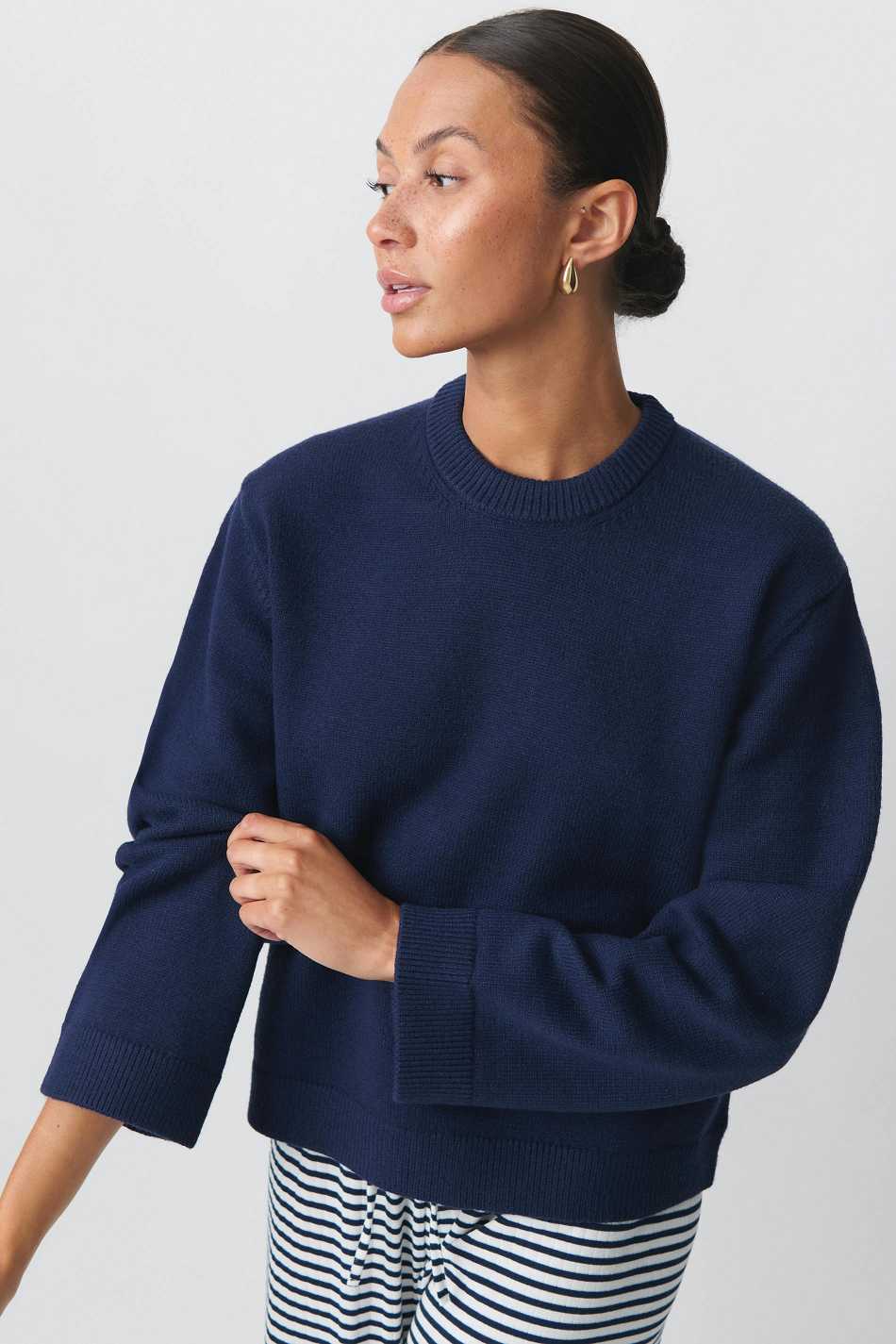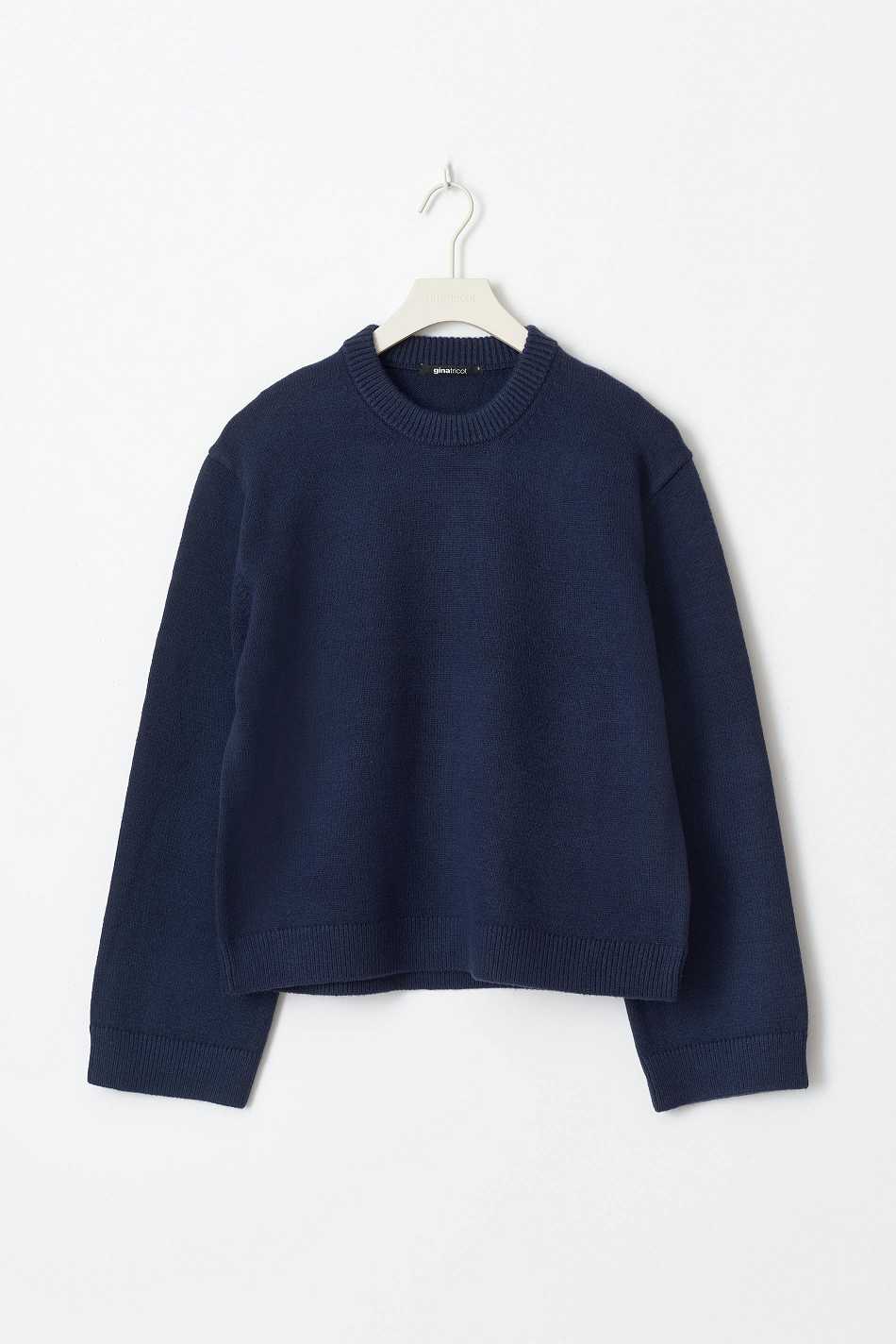 Knitted sweater with regular fit. The sweat is blue and has crew neckline. It has long sleeve and rib knit at sleeve ends and at the bottom.