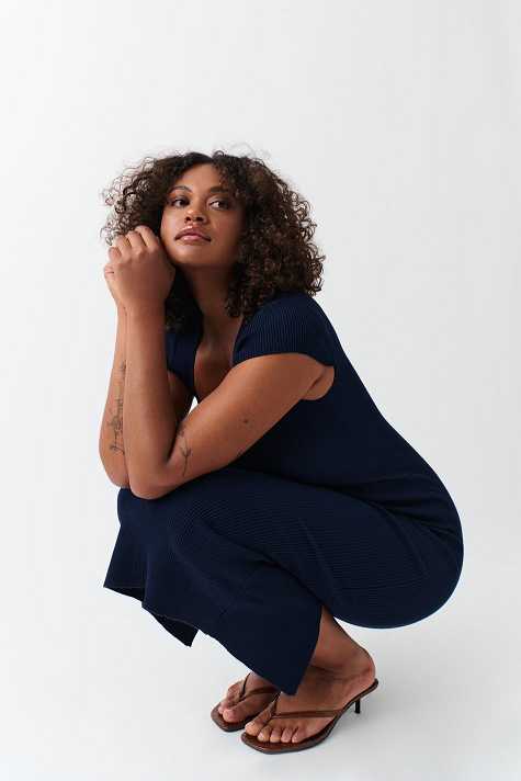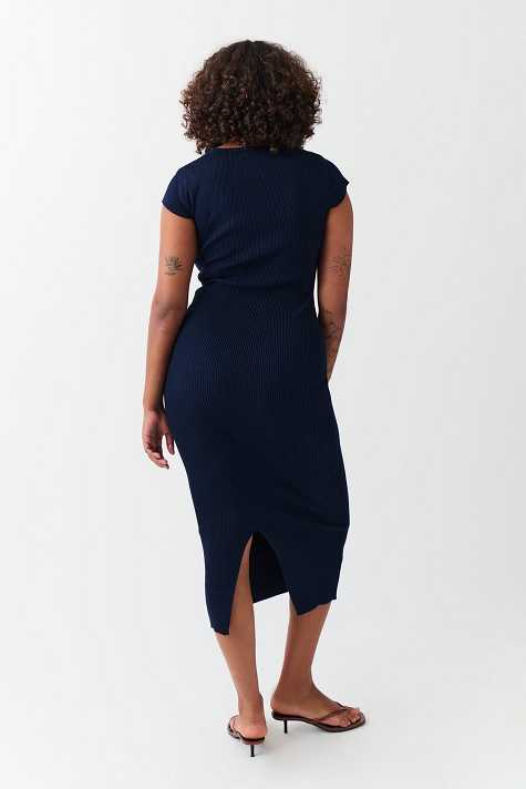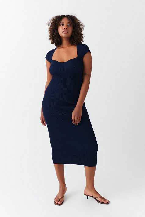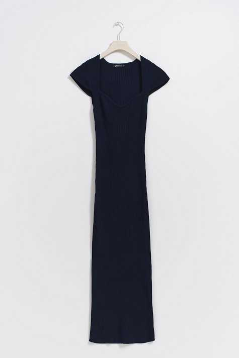 Knitted dress with sweetheart neckline. The dress is blue, short-sleeved and ribbed. It has figure-hugging fit, fully-fashioned section at chest, slit at the back and midi length.