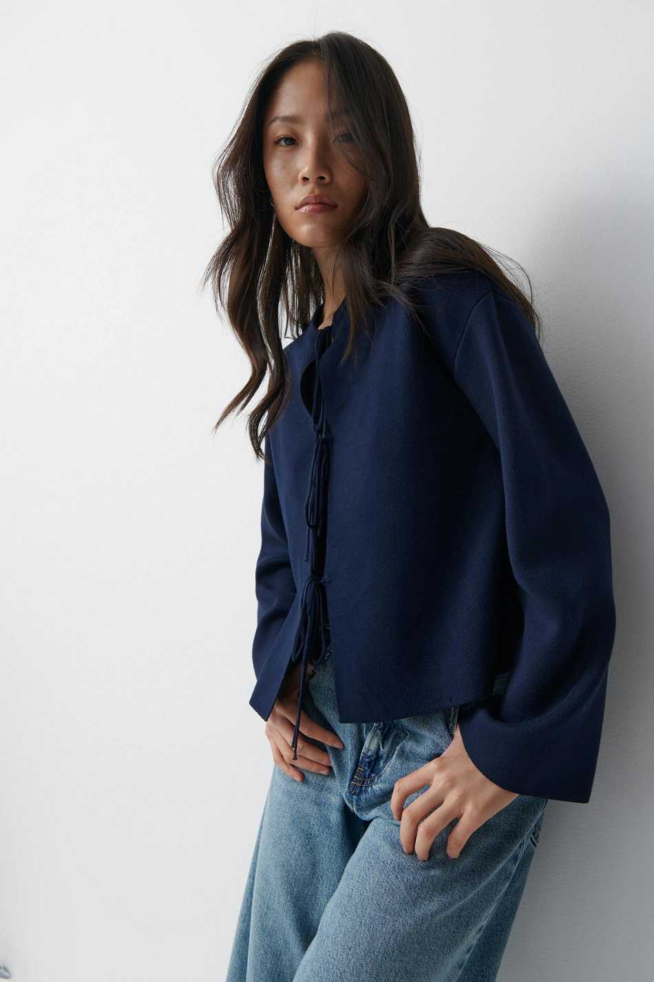 Soft knit cardigan with knot closure at the front. The cardigan is blue and has long sleeve. It has round, ribbed neckline and dropped shoulder.
