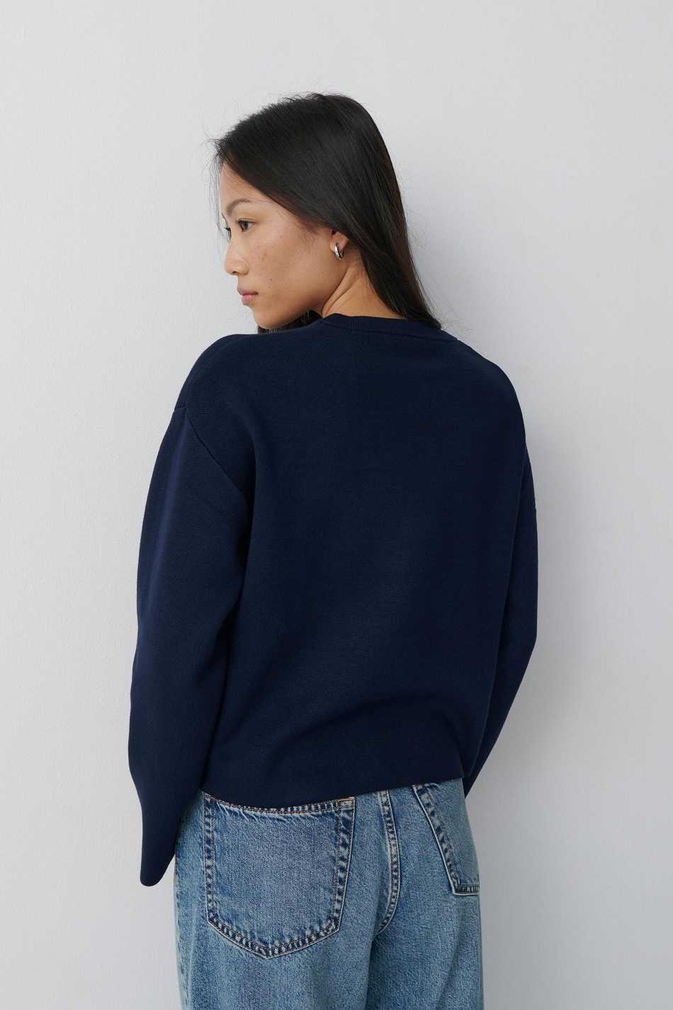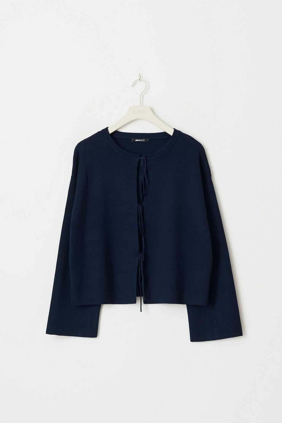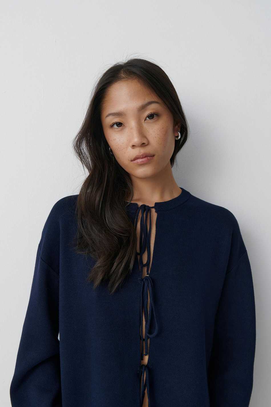 Soft knit cardigan with knot closure at the front. The cardigan is blue and has long sleeve. It has round, ribbed neckline and dropped shoulder.