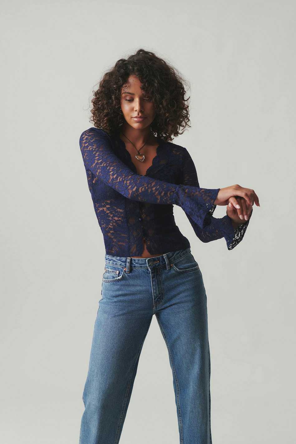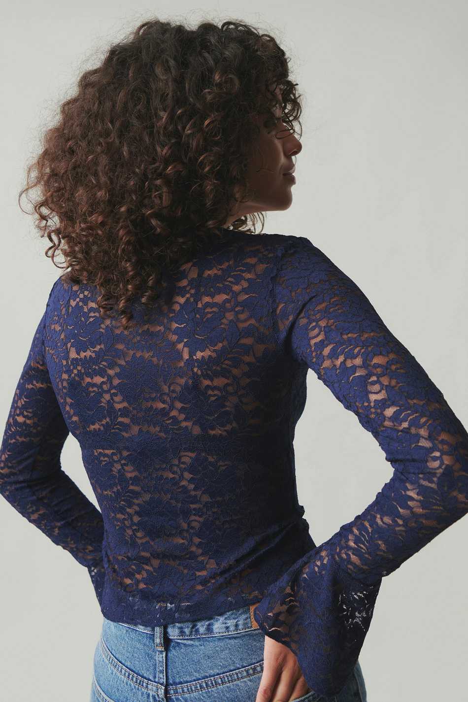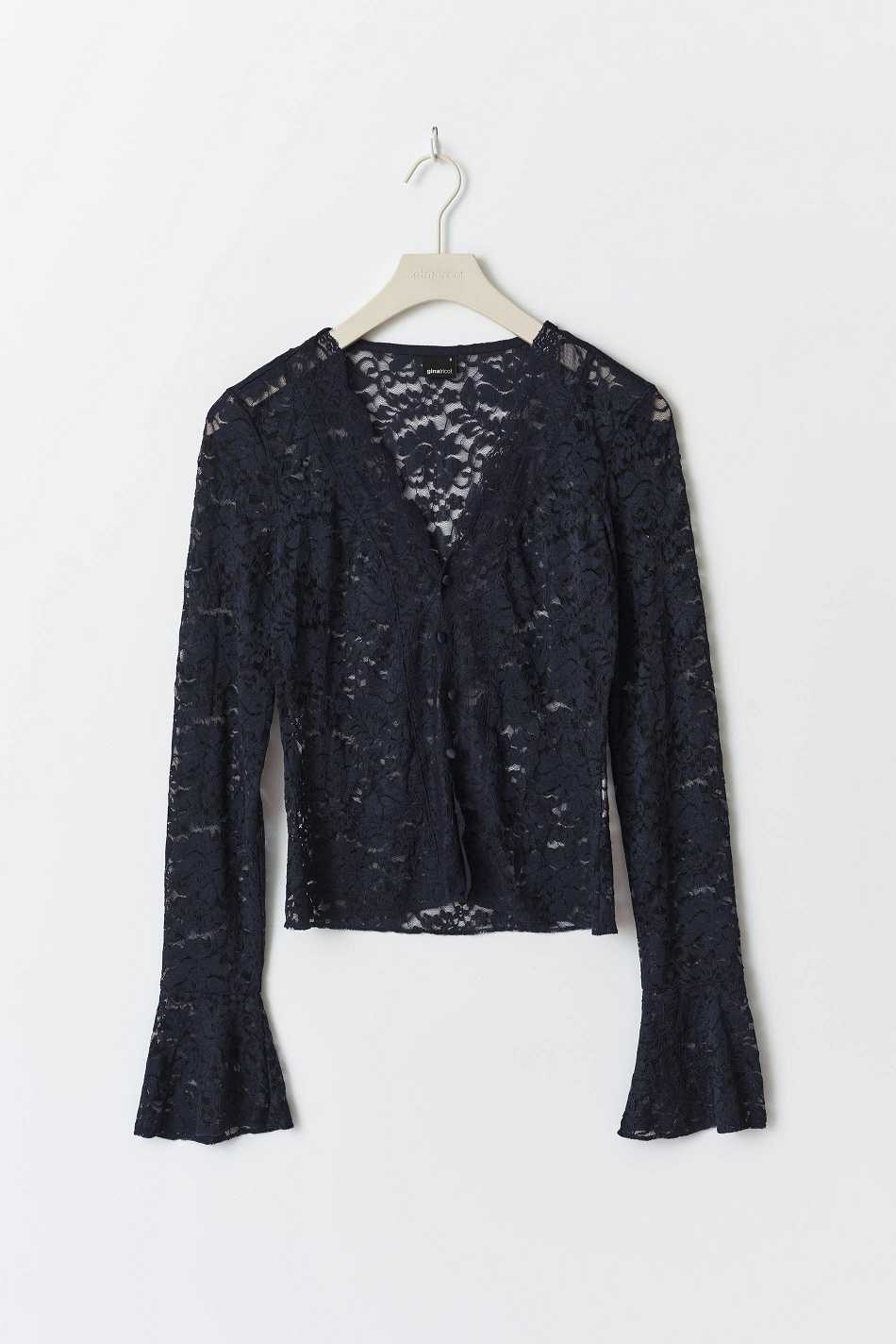 Long-sleeved lace top with buttons at the front. The lace top is navy and has v-neck. It has figure-hugging fit and lantern sleeve.