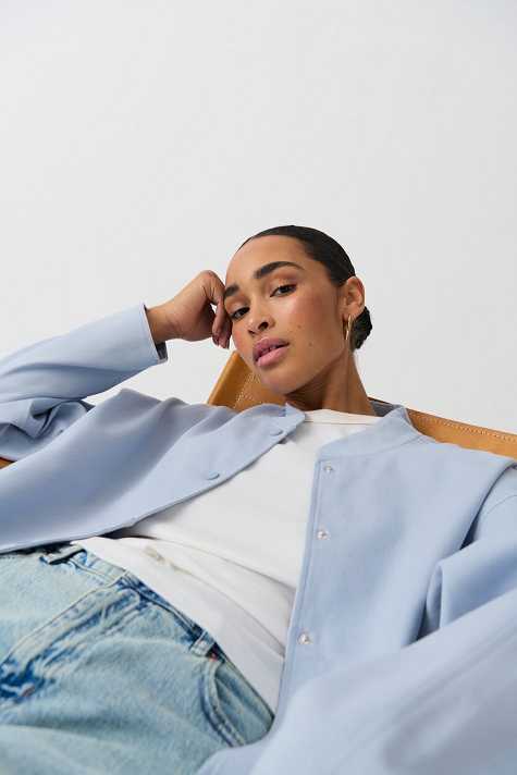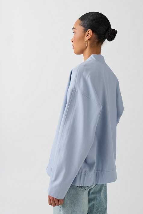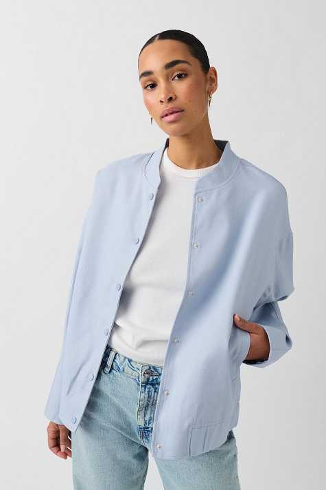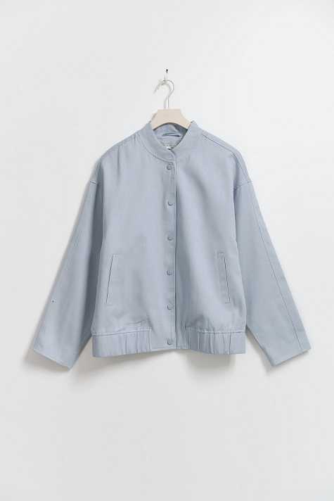 Bomber jacket in linen blend with an oversize fit. The jacket is blue and has snap button closure at the front. It has woven quality, small collar and slant pockets in the sides.