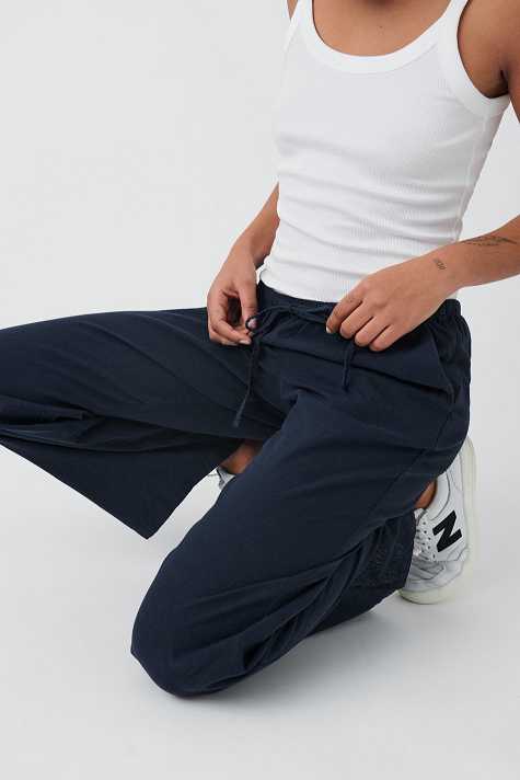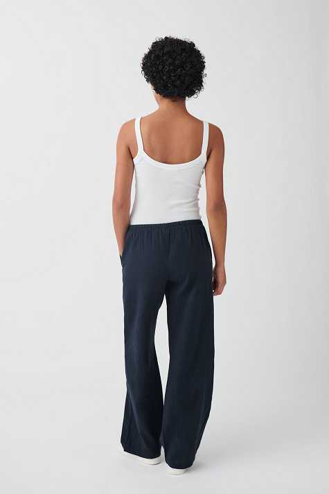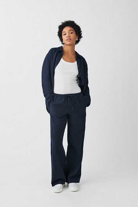 Linen trousers with wide legs. The linen trousers are marine and have mid waist. They have side pockets and elastic at the waist with self-tie drawstring at the front.