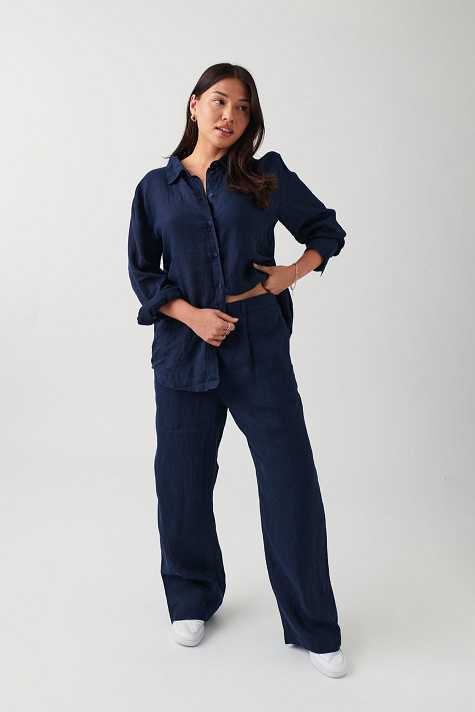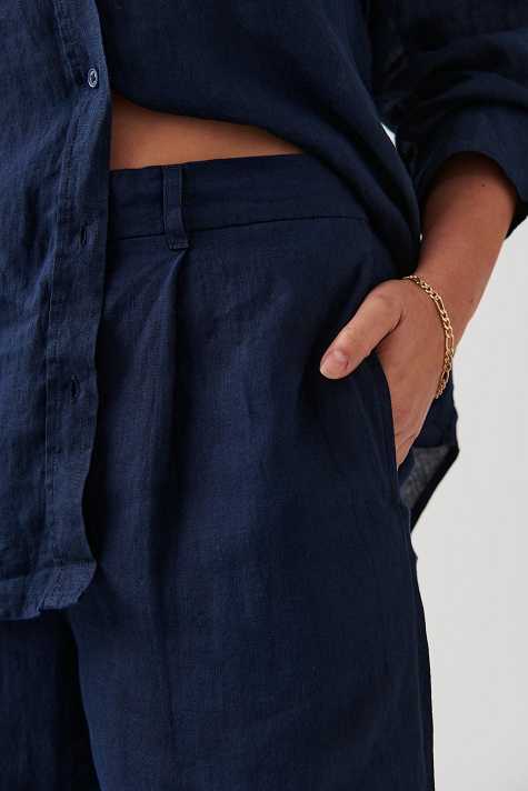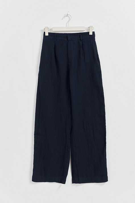 Linen trousers with loose-fitting style. The linen trousers are navy and have pleats at the front. They have straight legs, elastic at the back of the waist, belt loops, side pockets and a welt pocket at the back.