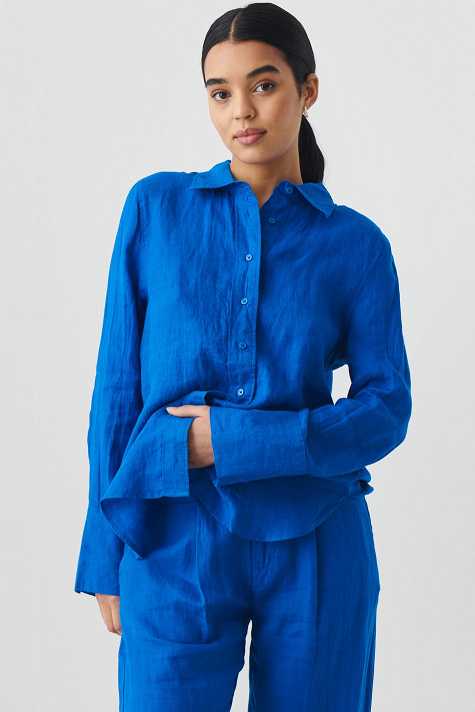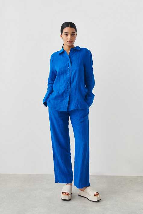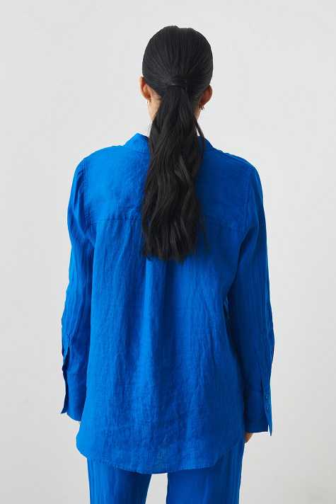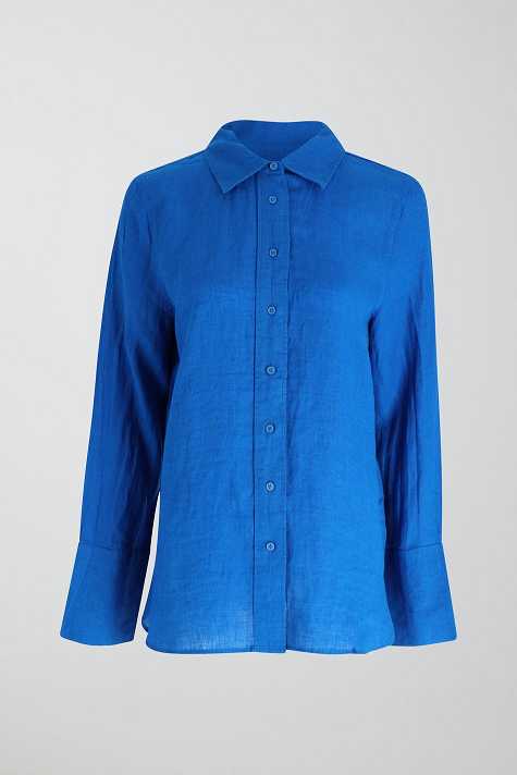 Linen shirt with oversize fit. The shirt is blue and has button placket in front. It has collar, yoke with pleats at the back and long sleeve with button and cuff.