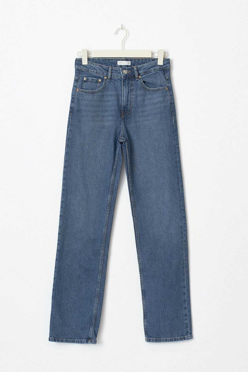 Straight jeans with mid waist. The jeans are blue and have straight fit in stretch denim. They have zip fly, pockets at the front and back and longer leg length. Perfect for those who are 175 cm (5 ft 9 in.) or taller. Use our size guide to find your size.