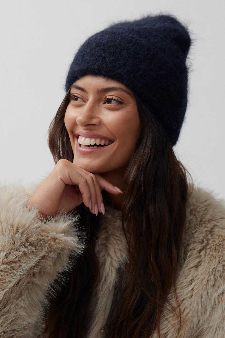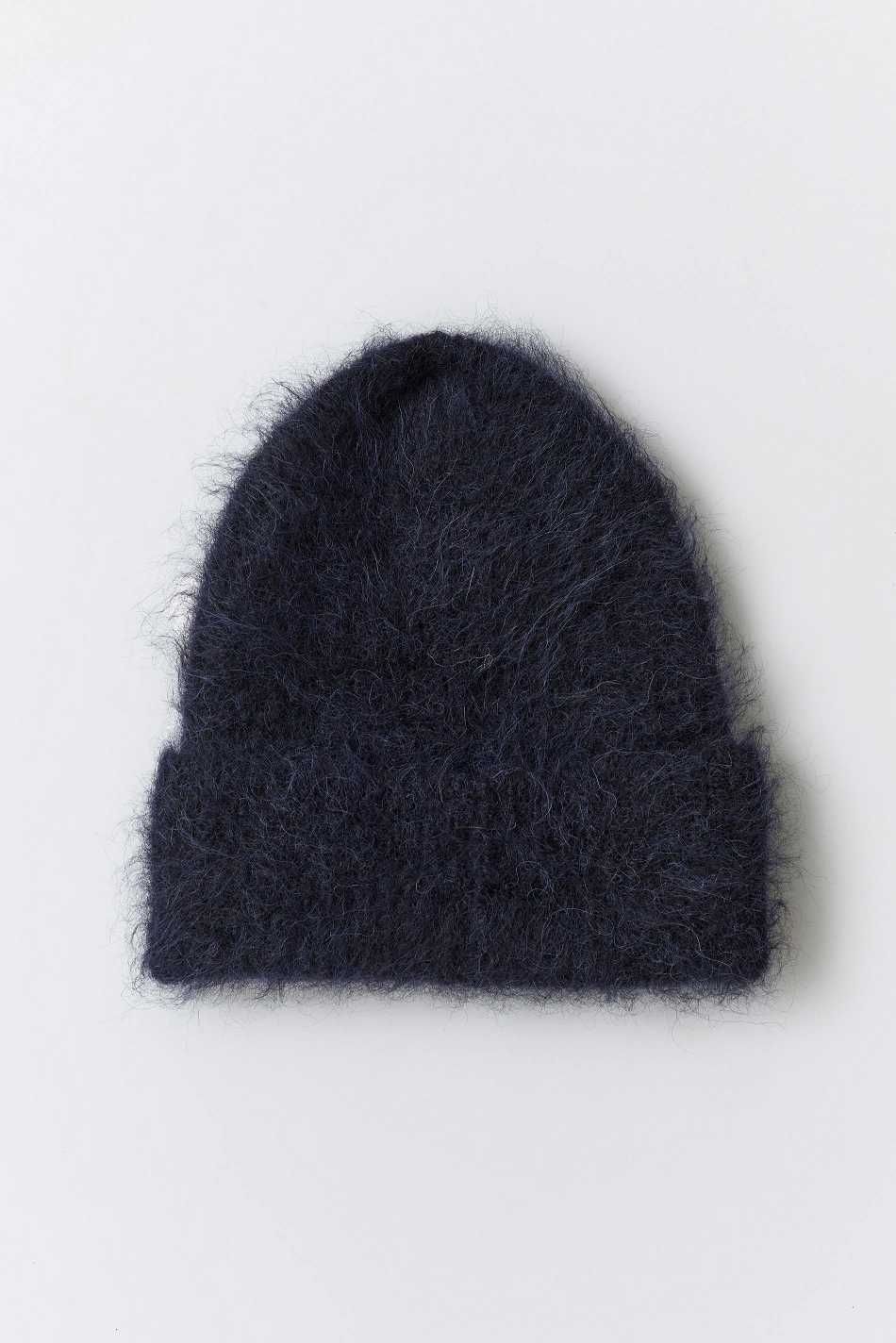 Knitted beanie in soft alpaca blend with fuzzy quality. The beanie is navy.