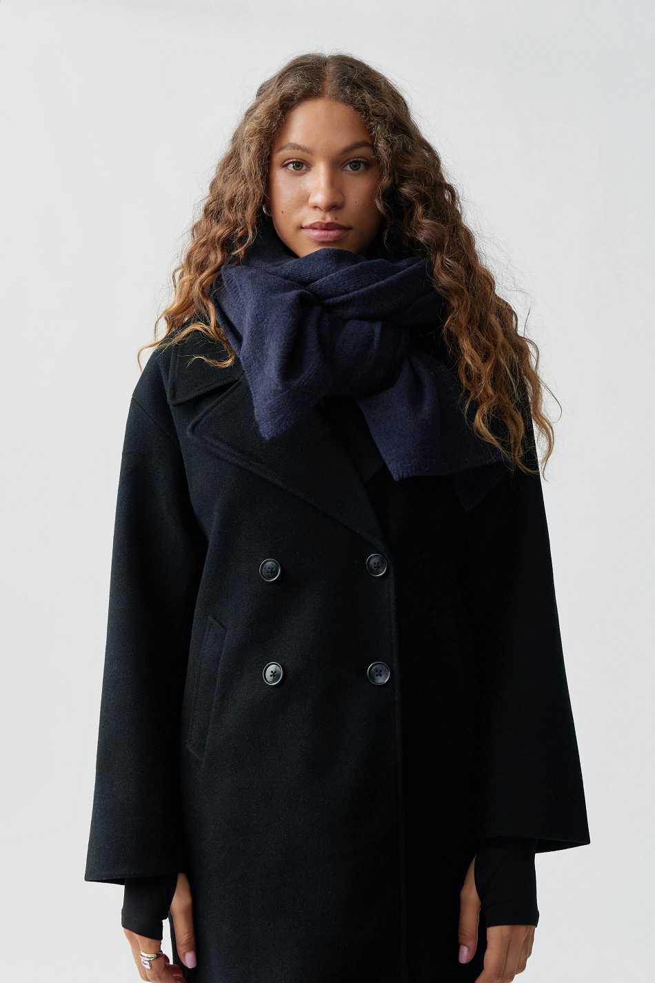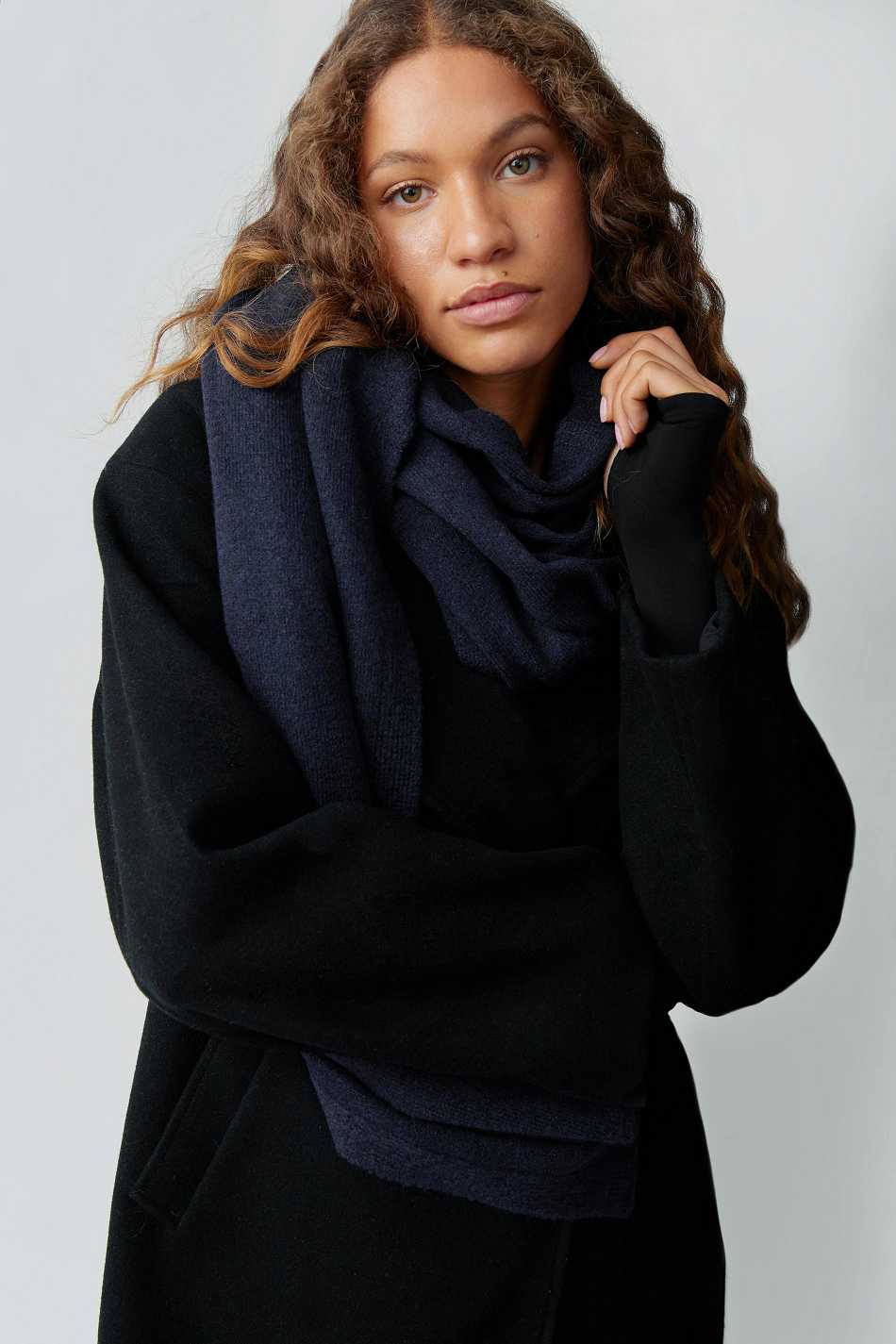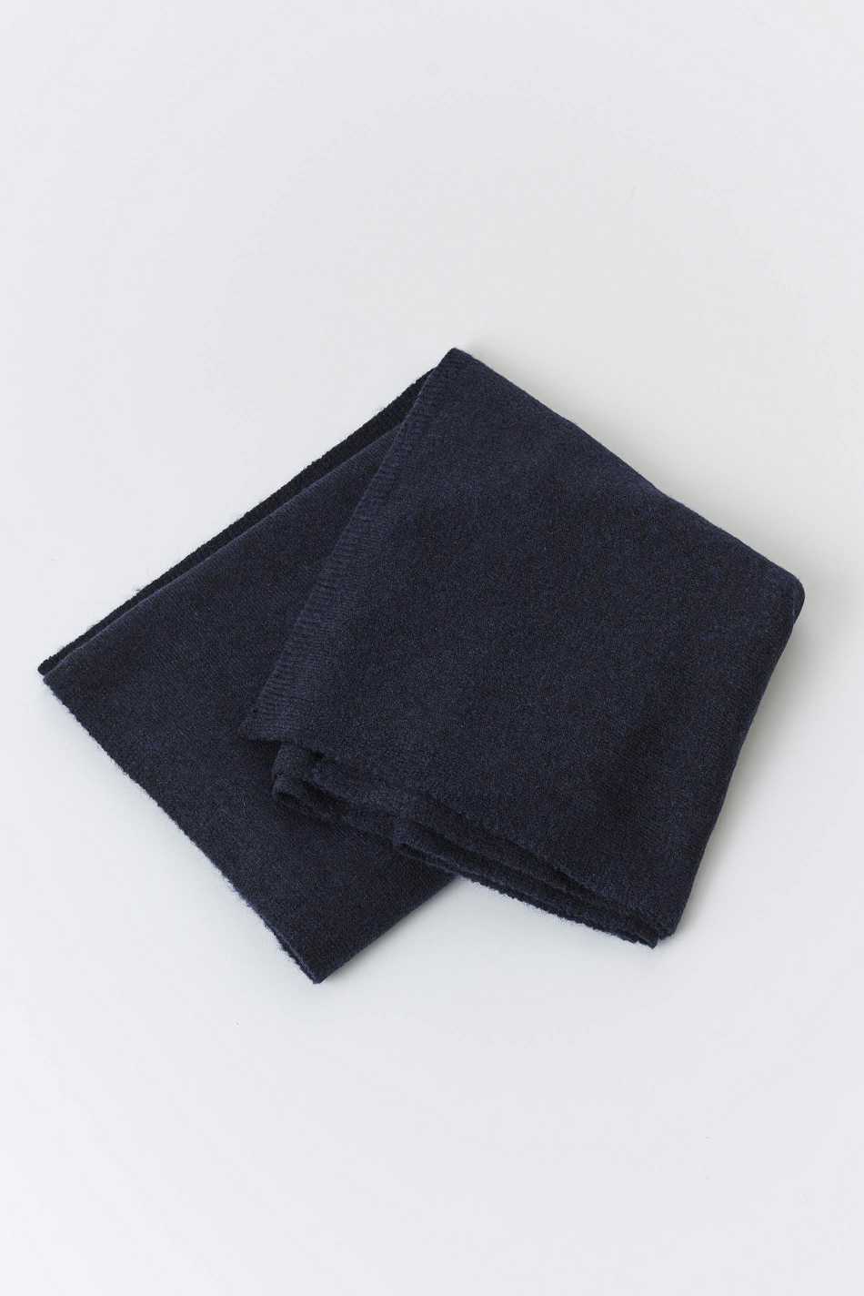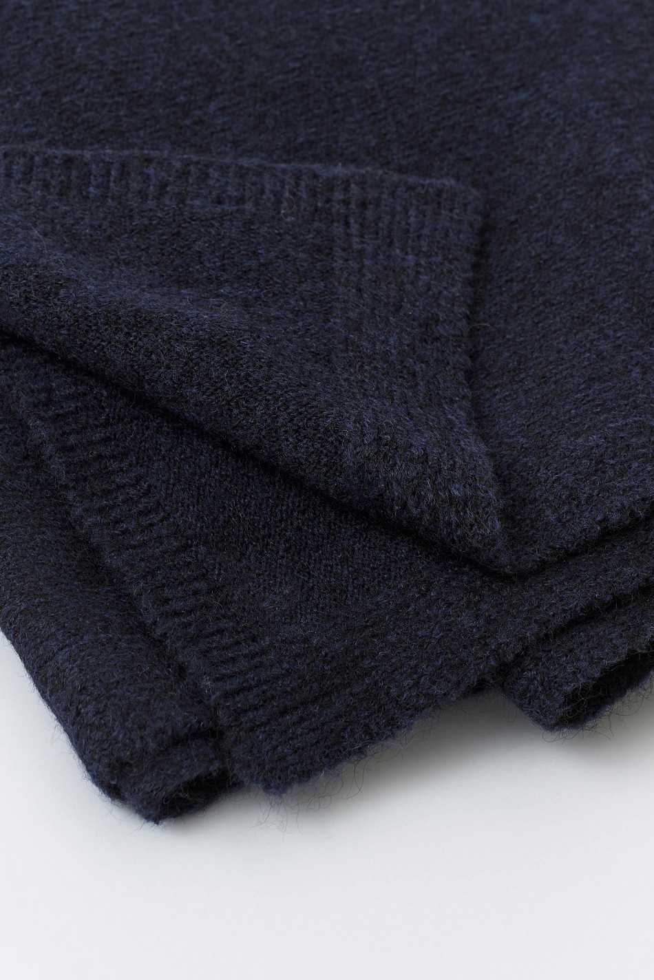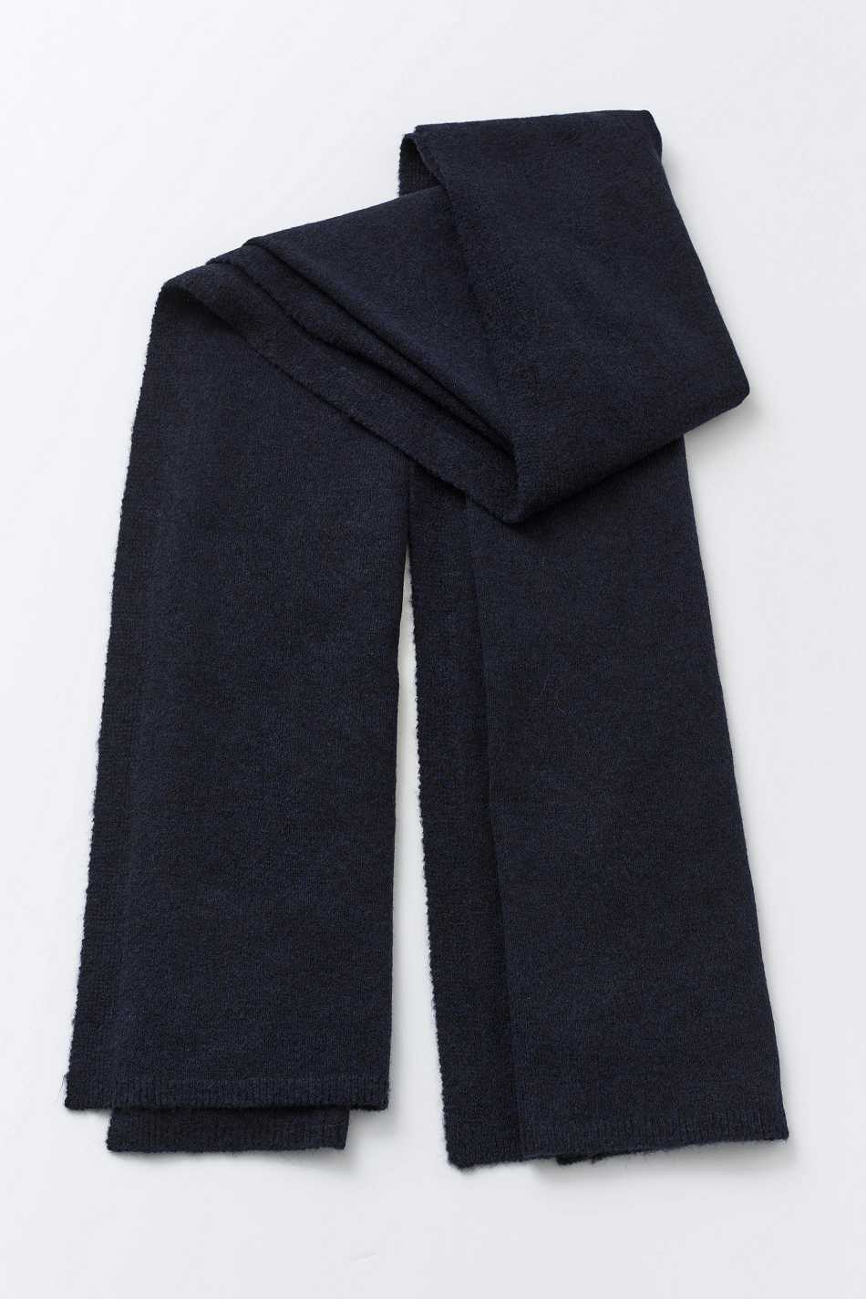 Knitted scarf with ribbed trims. The scarf is blue and has soft quality.