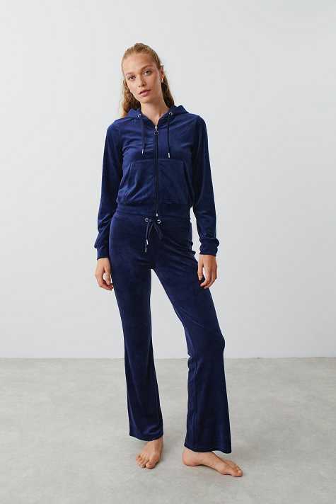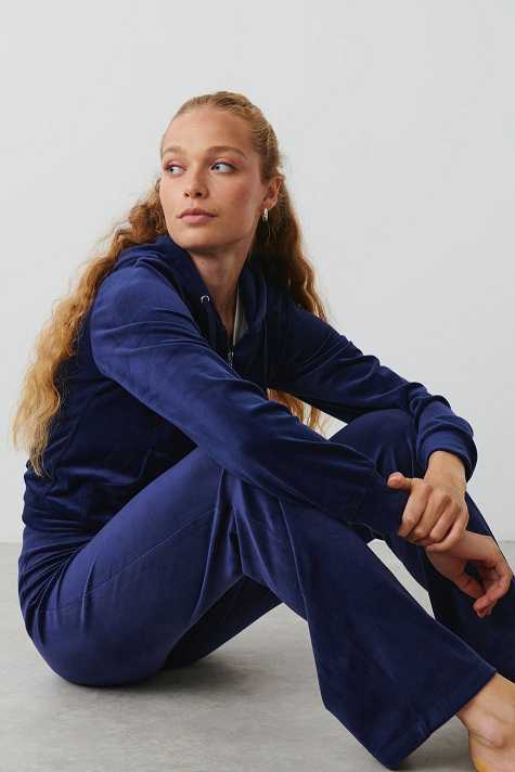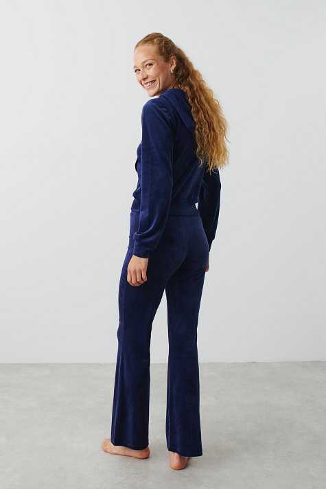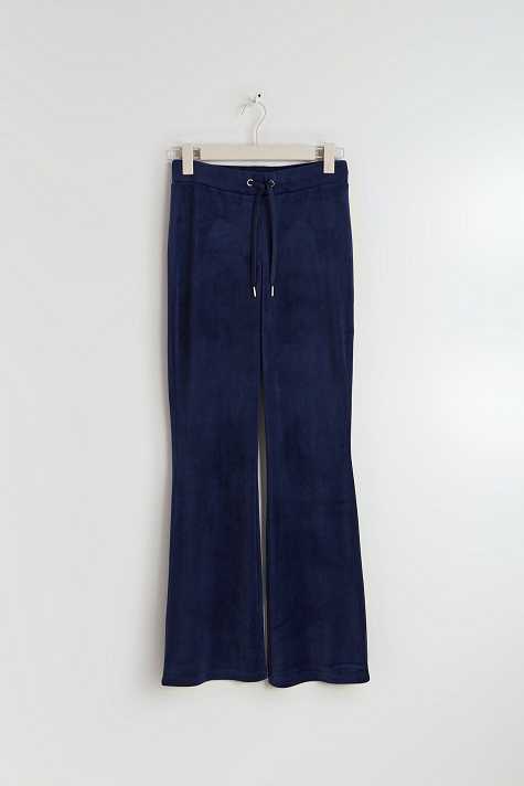 Flared trousers in velour with low waist. The trousers are blue and have regular fit. They have elasticized waist and self-tie drawstring with silver details at the front.