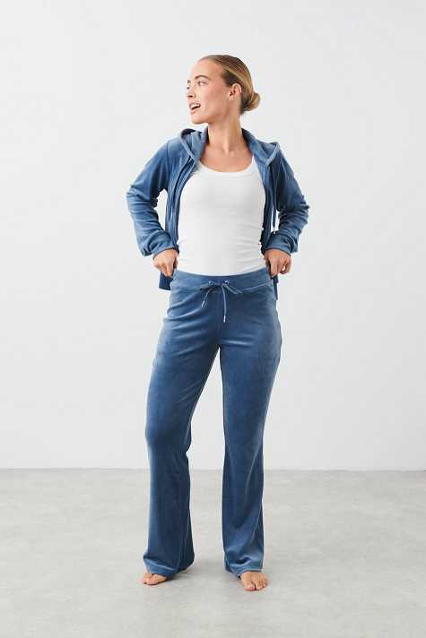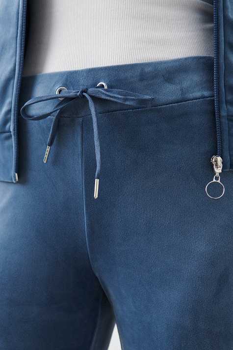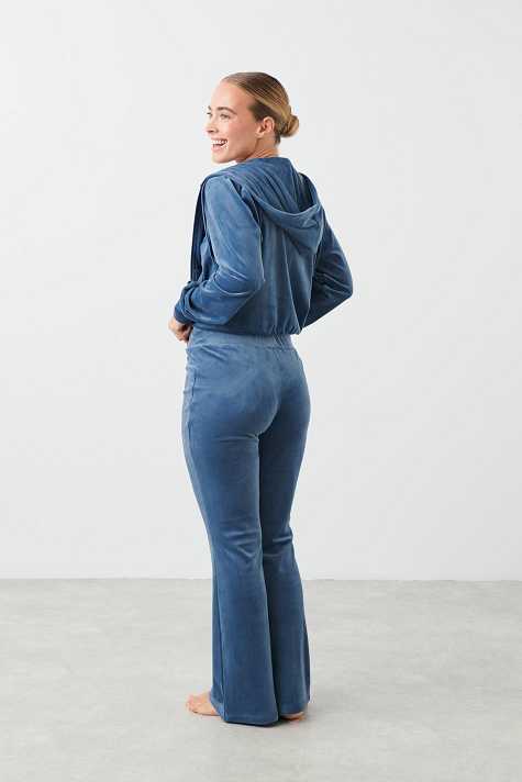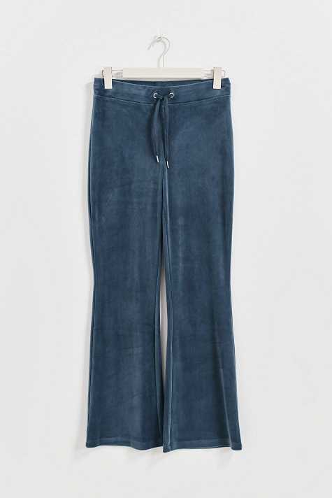 Flared trousers in velour with a regular fit. The trousers are blue and have low waist. They have regular fit, elasticized waist and self-tie drawstring with silver details at the front.