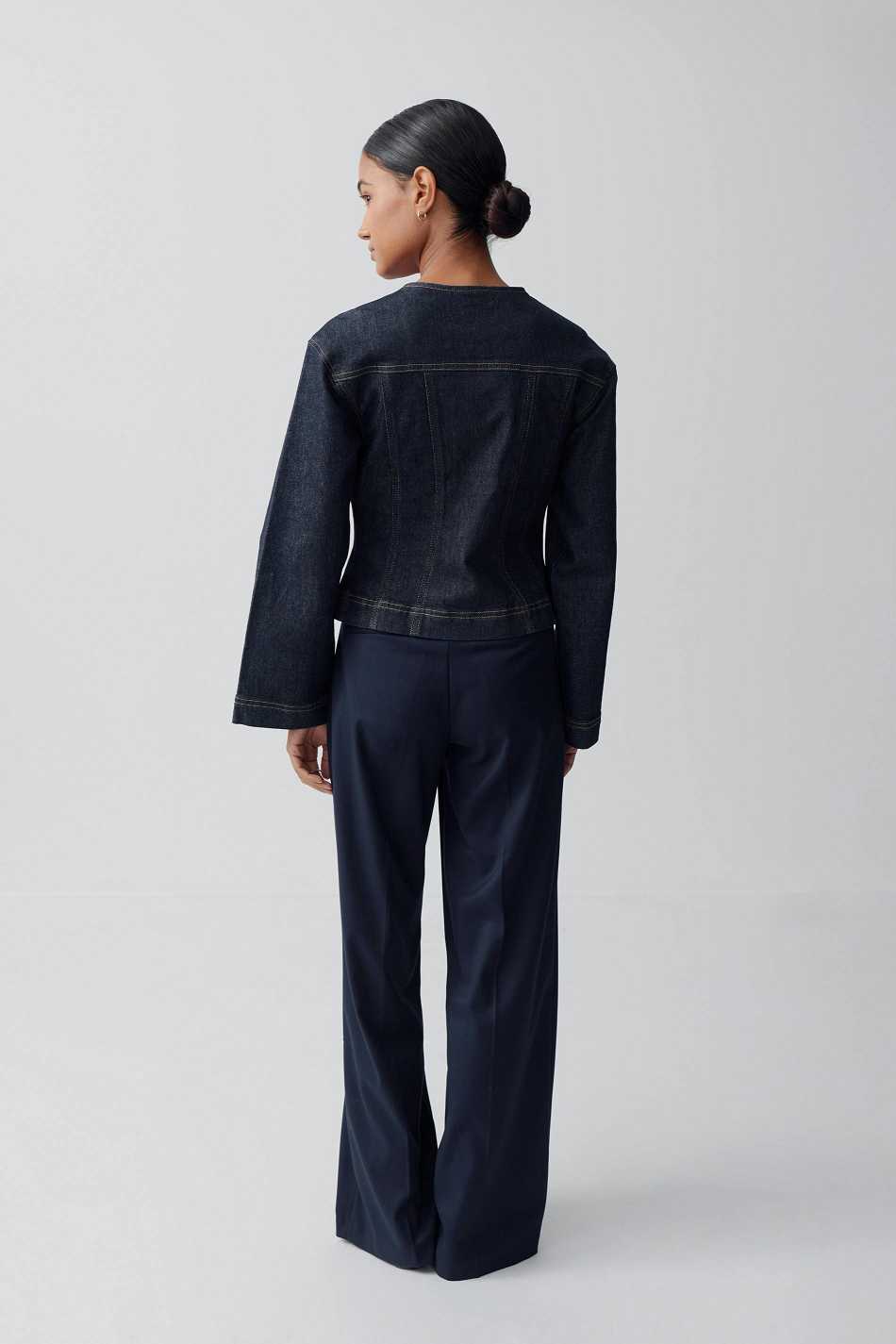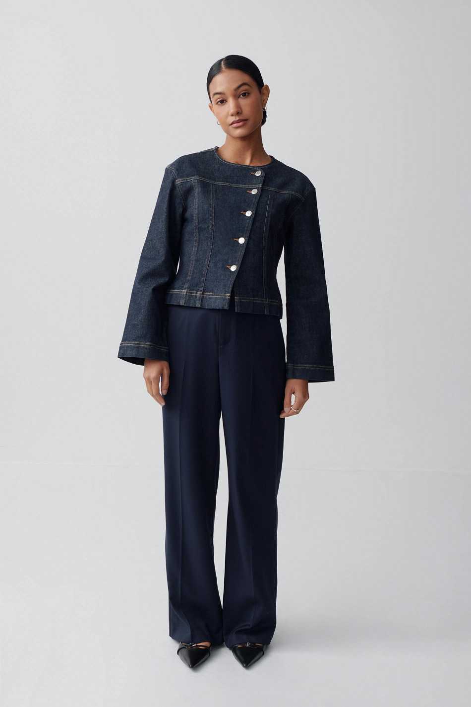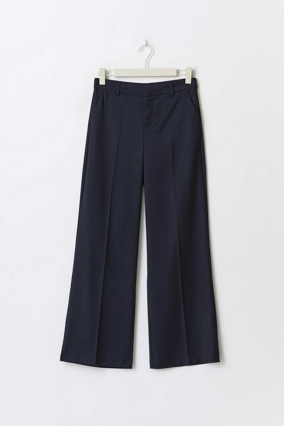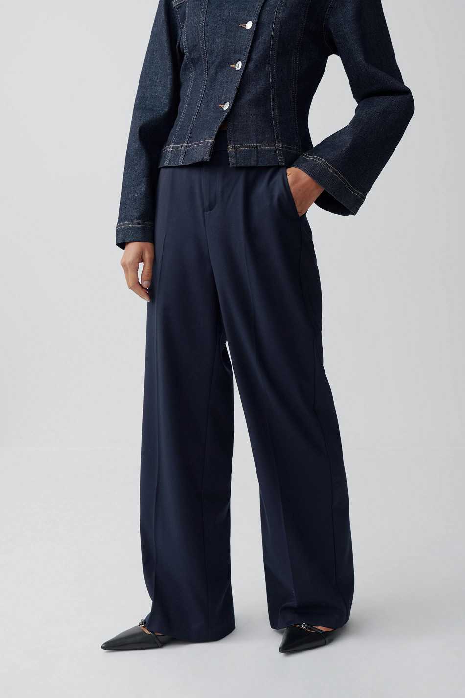 Wide suit trousers with creases at the front. The trousers are navy and have pockets in the sides. They have zip fly and belt loops.