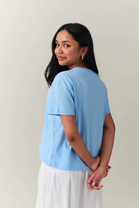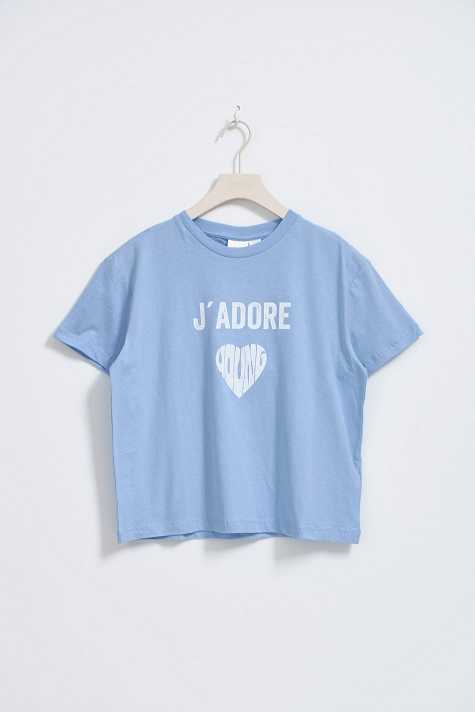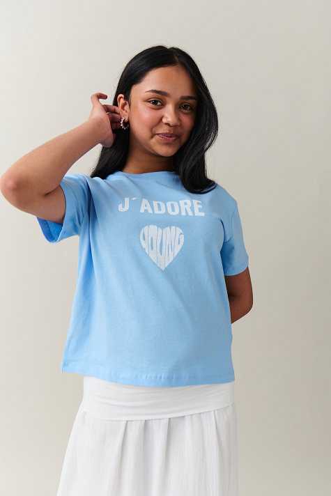 T-shirt in jersey with print at the front. The t-shirt is blue and has loose-fitting style. It has round, ribbed neckline.