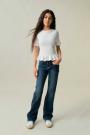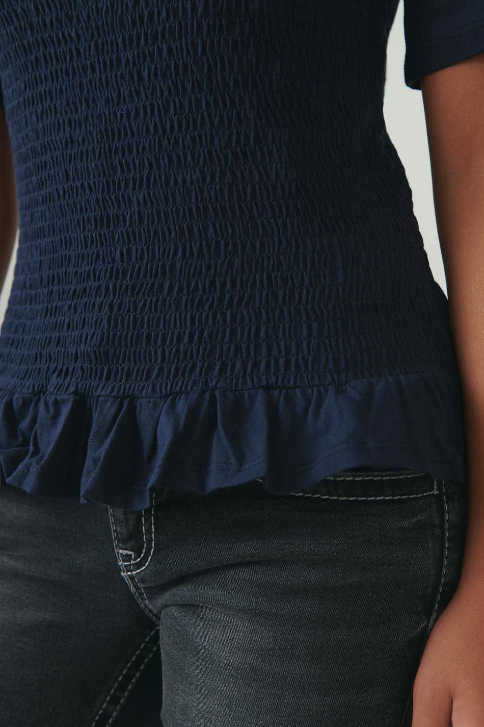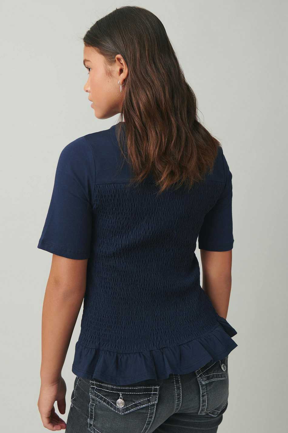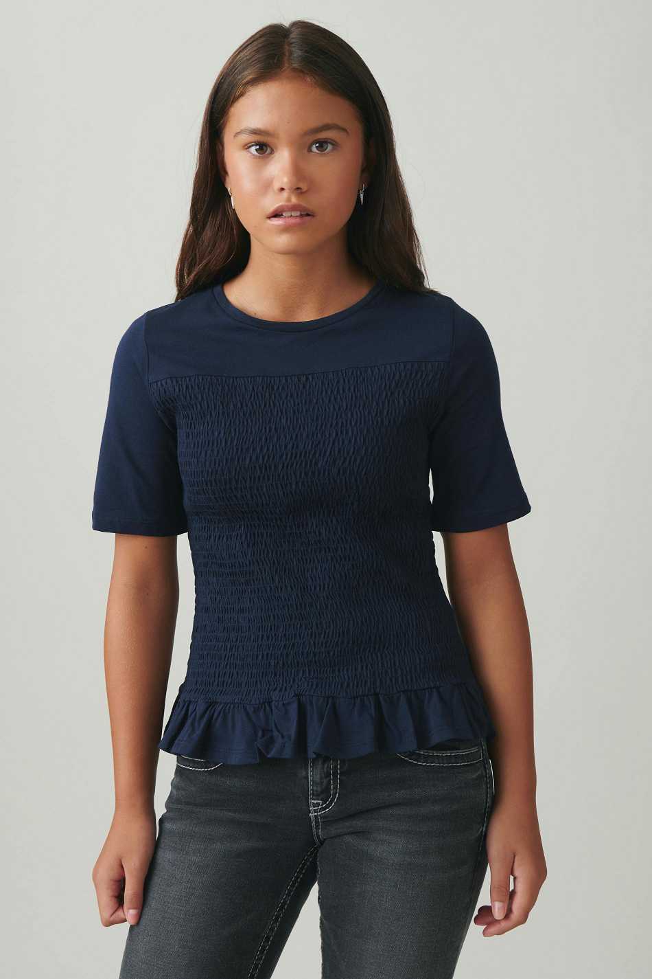 Smocked top by Gina Tricot Young with short sleeve. The top is navy and has frill at the bottom. It has regular fit and round neckline.