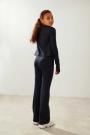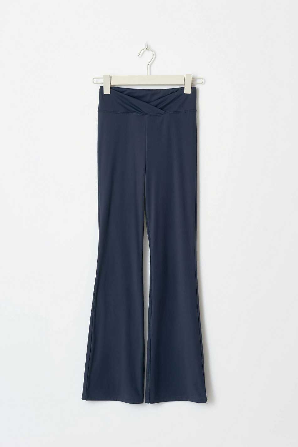 Sporty leggings with overlap detail at the waist. The leggings are navy and have soft, flexible quality. They have flared legs, figure-hugging fit and mid waist with elastic. The garment is made of material that wicks away moisture and dries quickly, perfect for all the activities you choose.