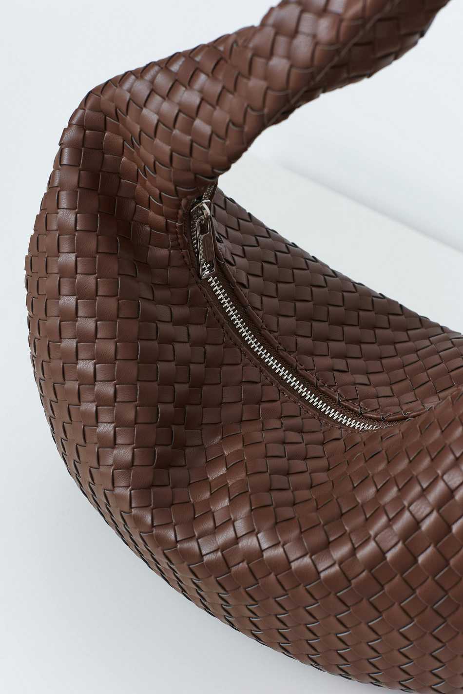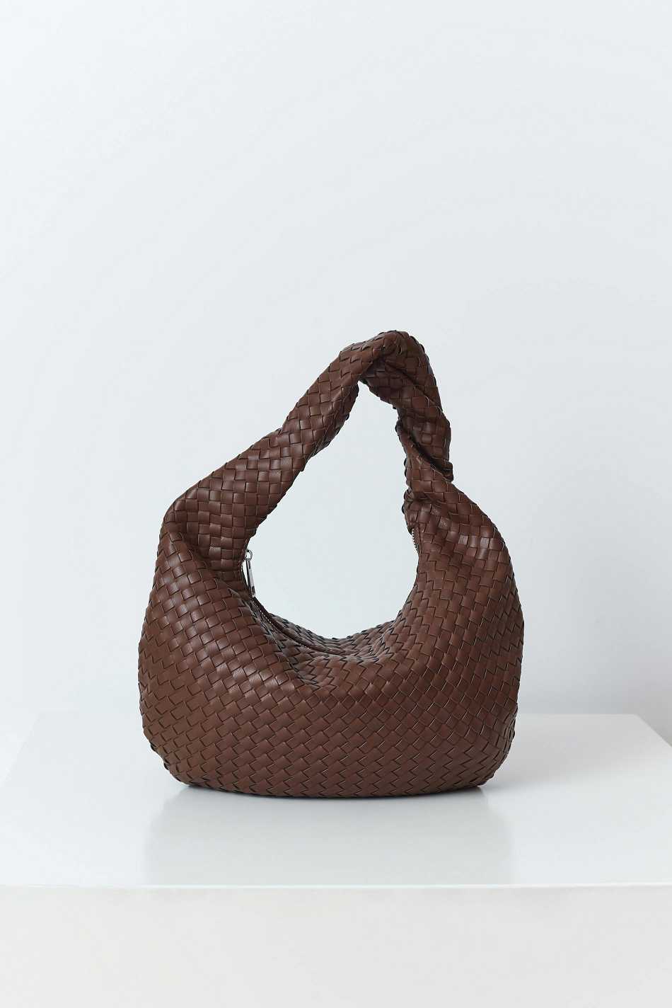 Braided bag with twisted shoulder strap. The bag is brown and has inner compartment. It has zip closure at the top. Perfect everyday bag.