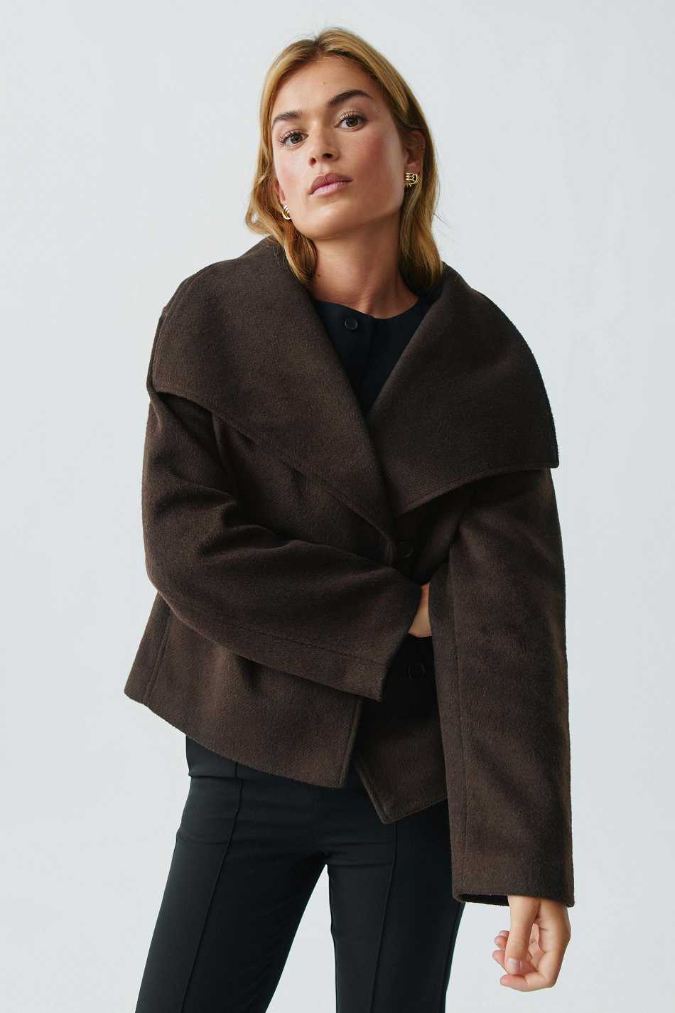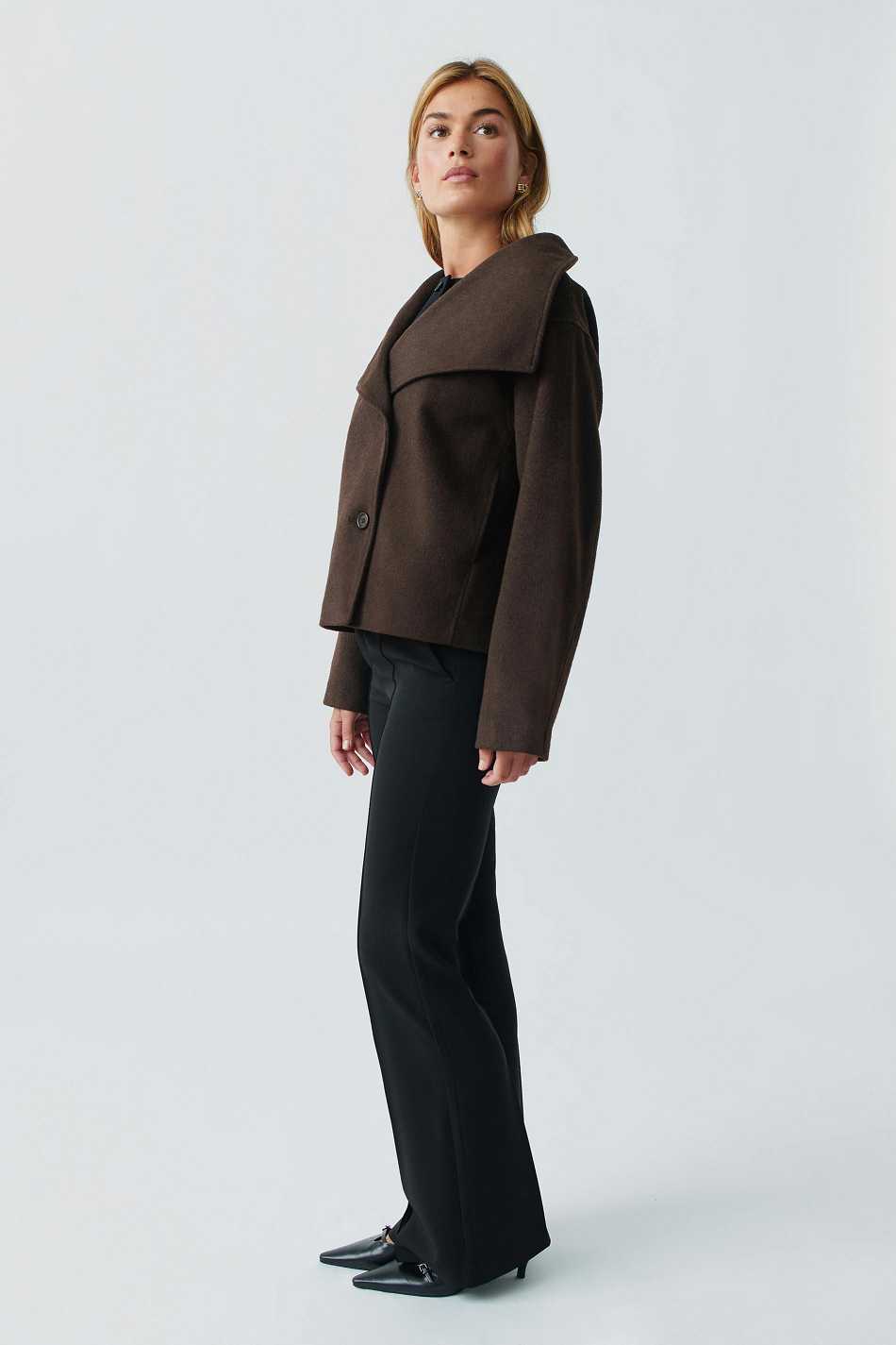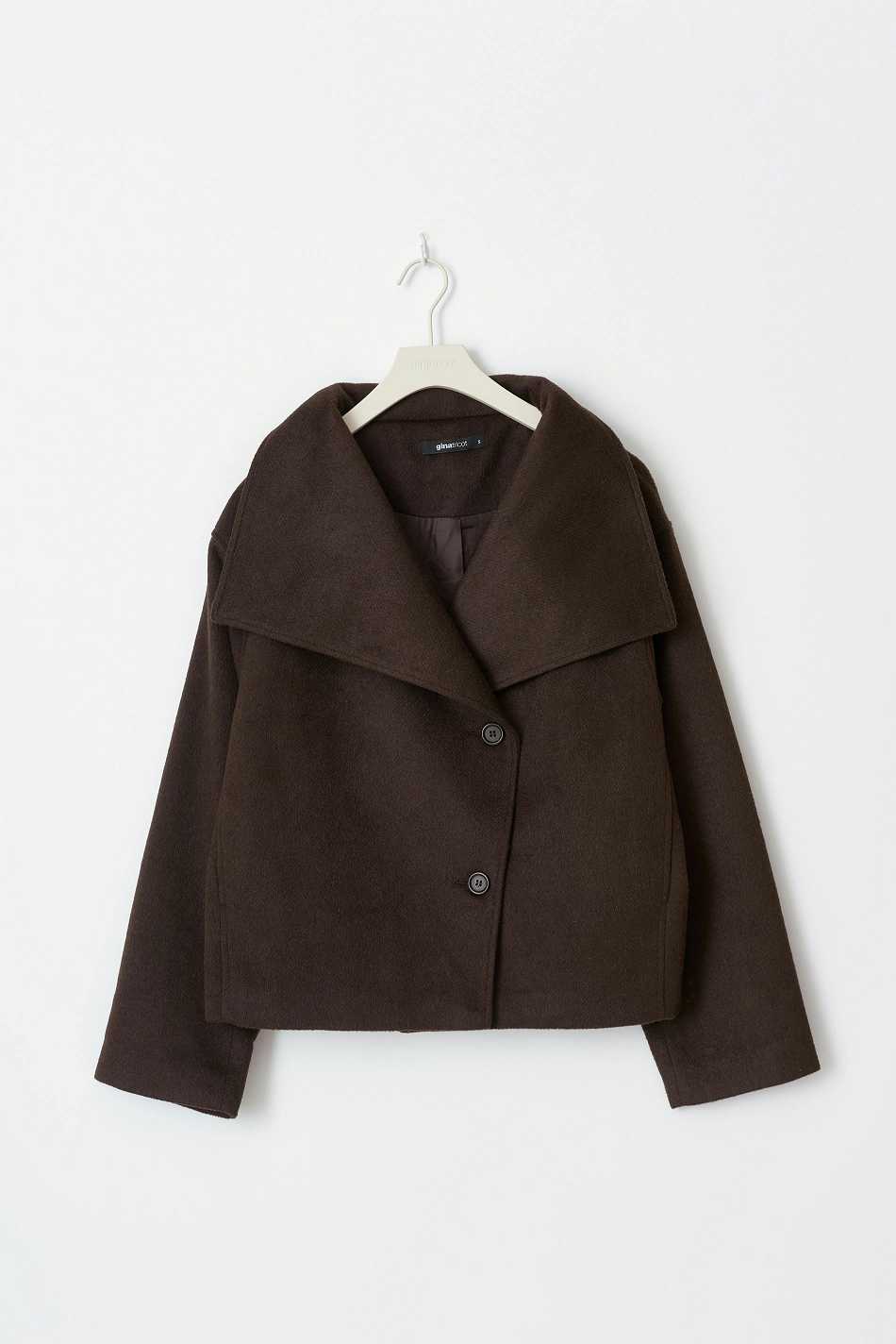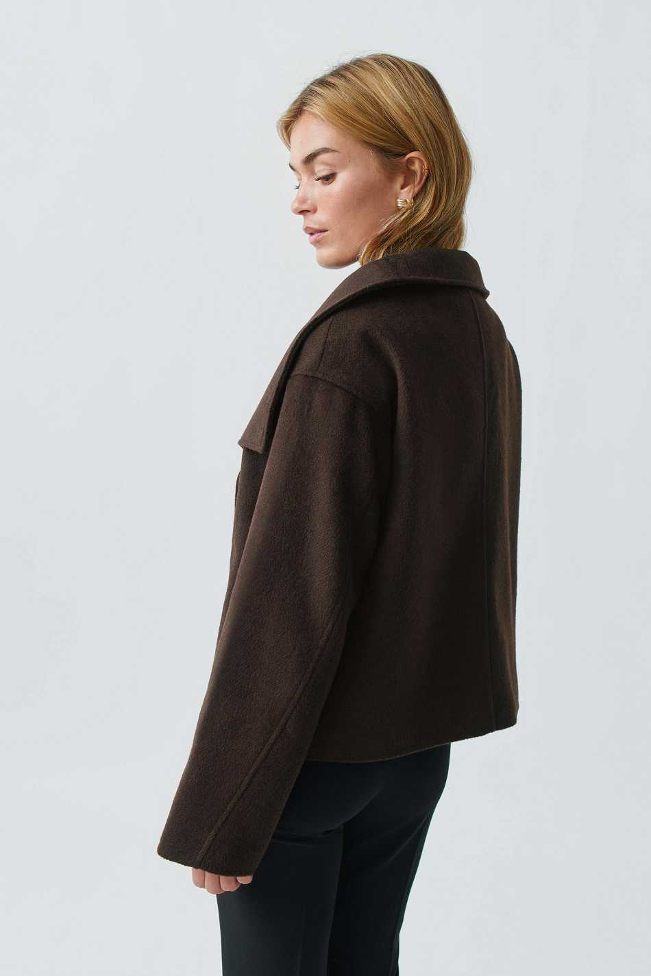 Short jacket with funnel neck. The jacket is brown and has buttoning at the front. It has regular fit, long sleeve and side pockets. Fully lined.